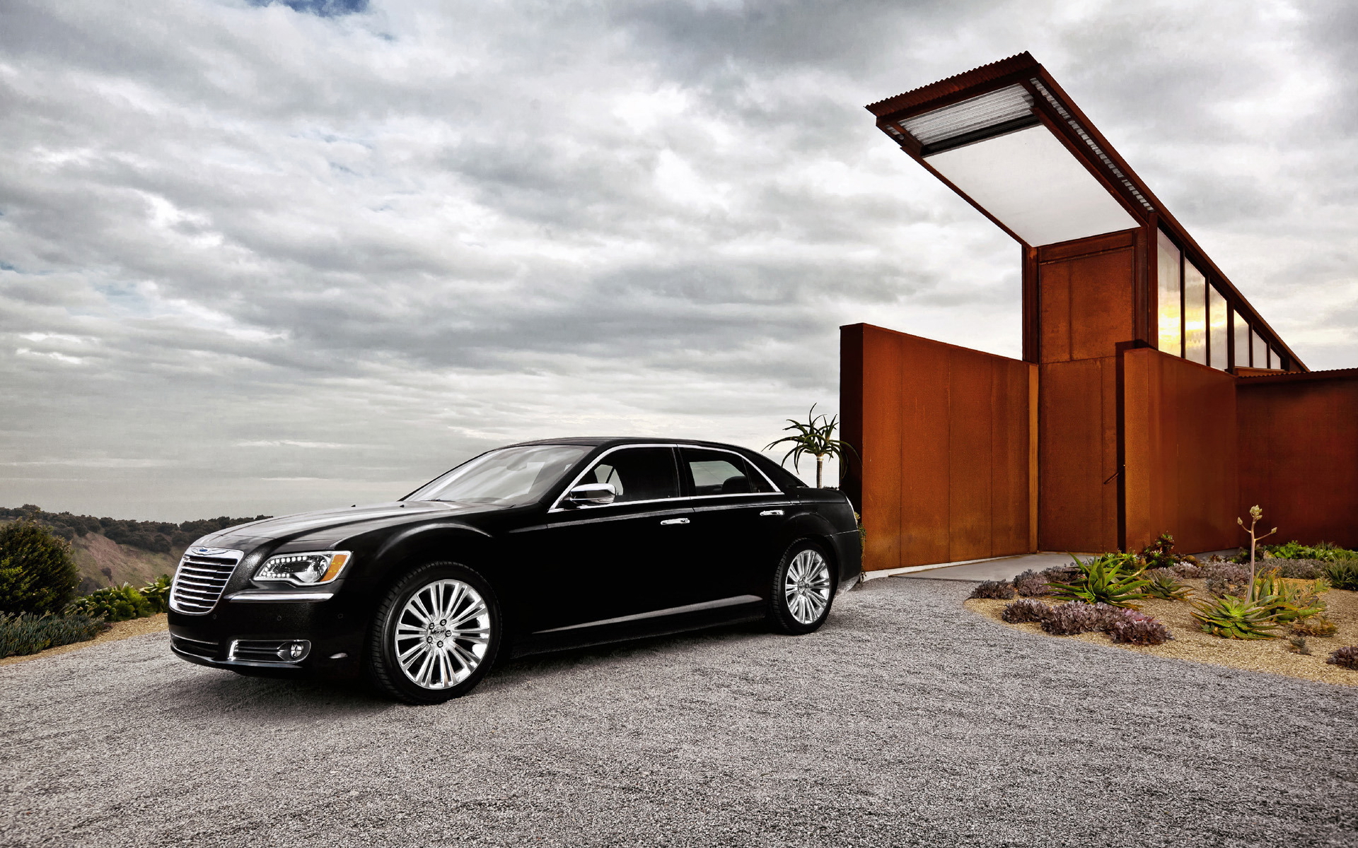 Description: A black car parked in front of a building with a sky background and a wooden door on the side of the building.
