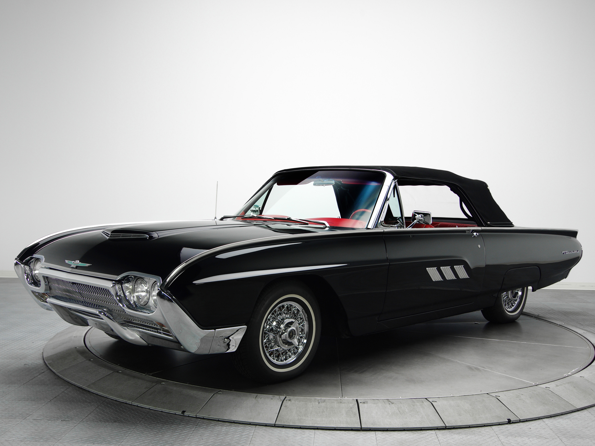 Description: A black car is parked on a circular surface in a room with a white wall and a black floor.
