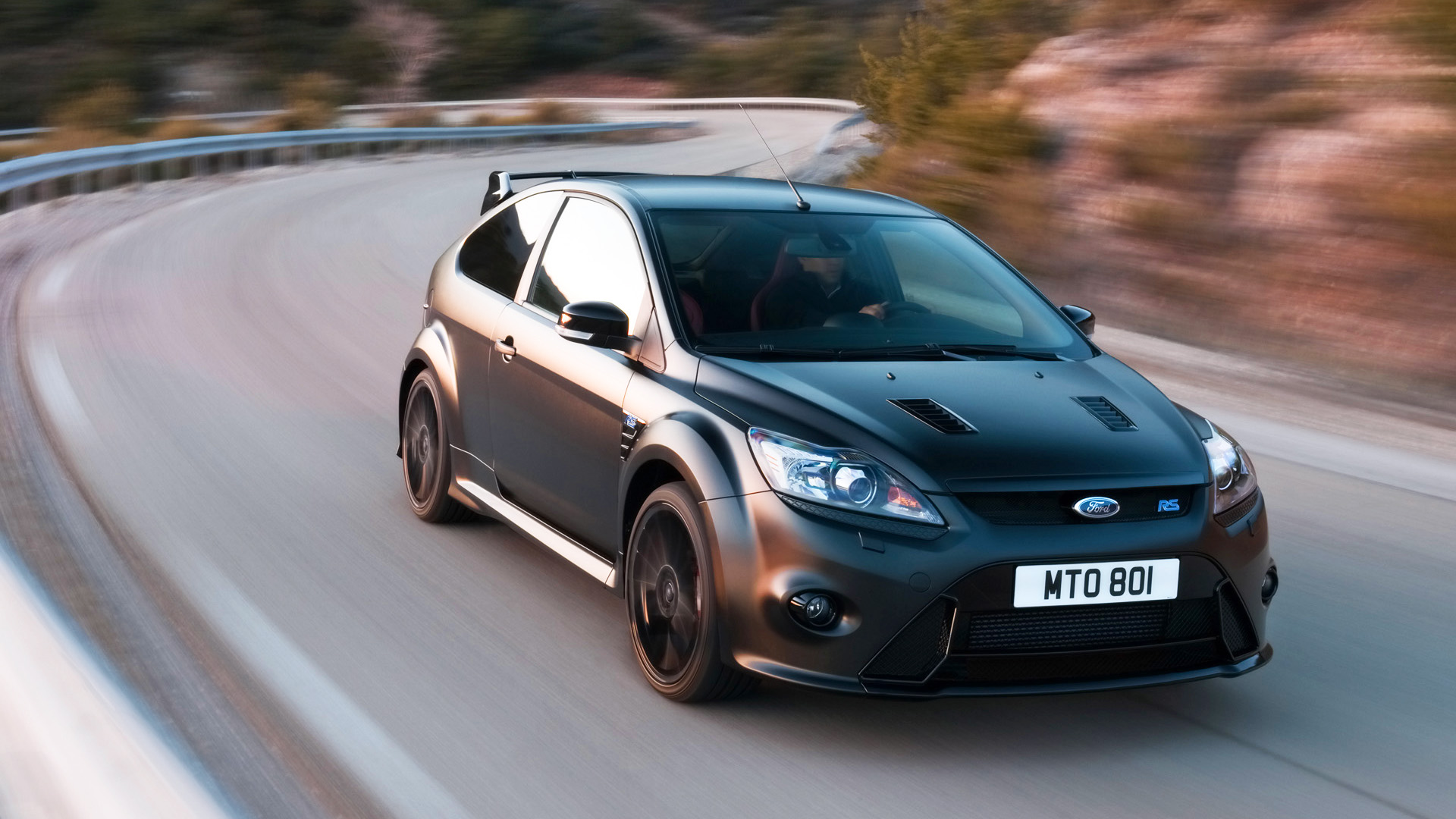 Description: A black car driving down a road next to a forest of trees and a hill side with a sign on it.