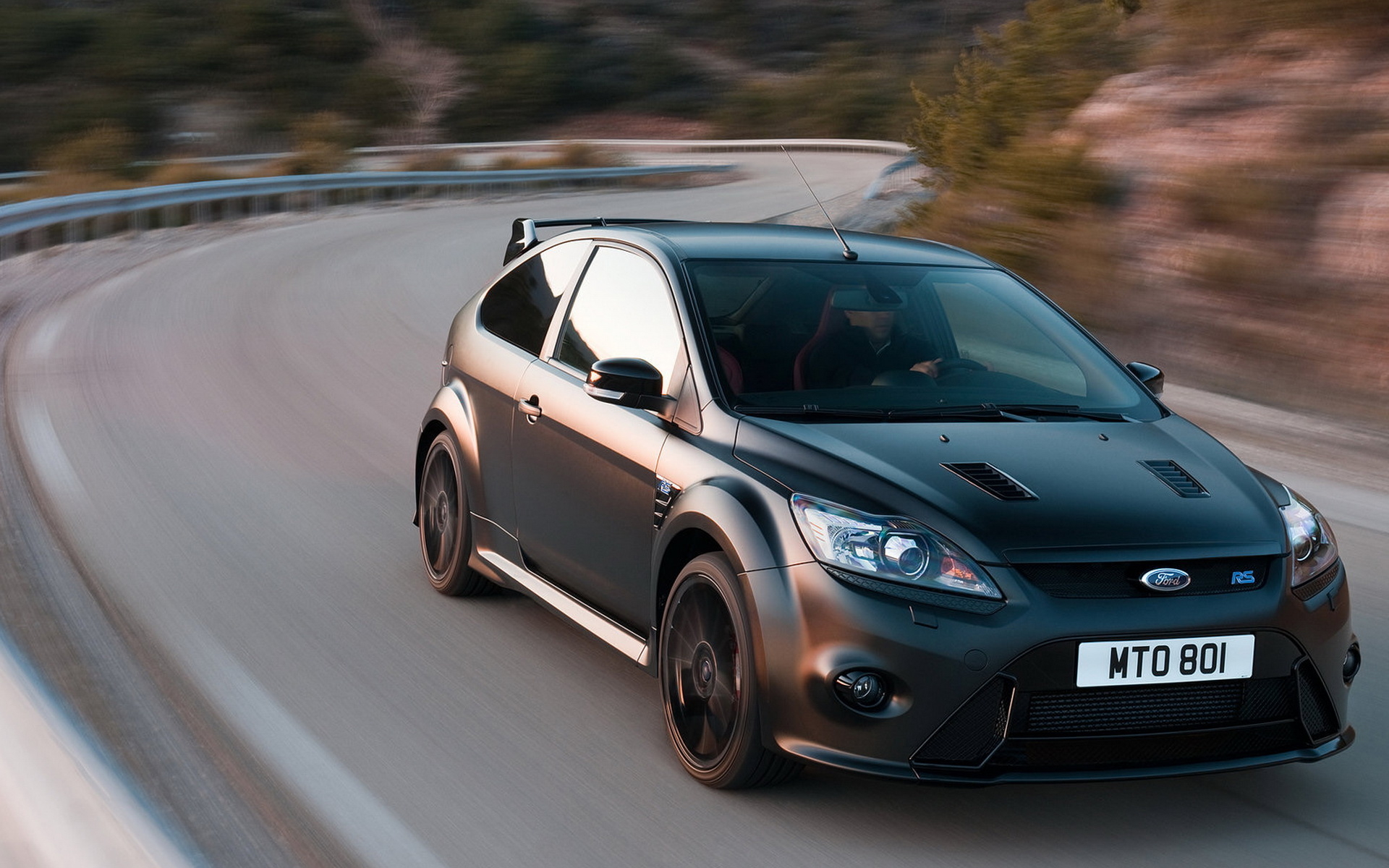 Description: A black car driving down a road next to a forest and a hill side with trees on it's sides.