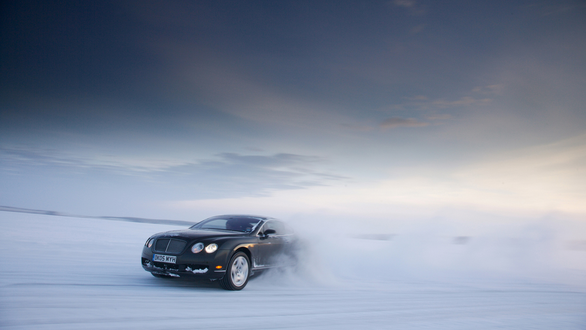 Description: A black car driving through a snow covered field with a sky background and clouds in the background.