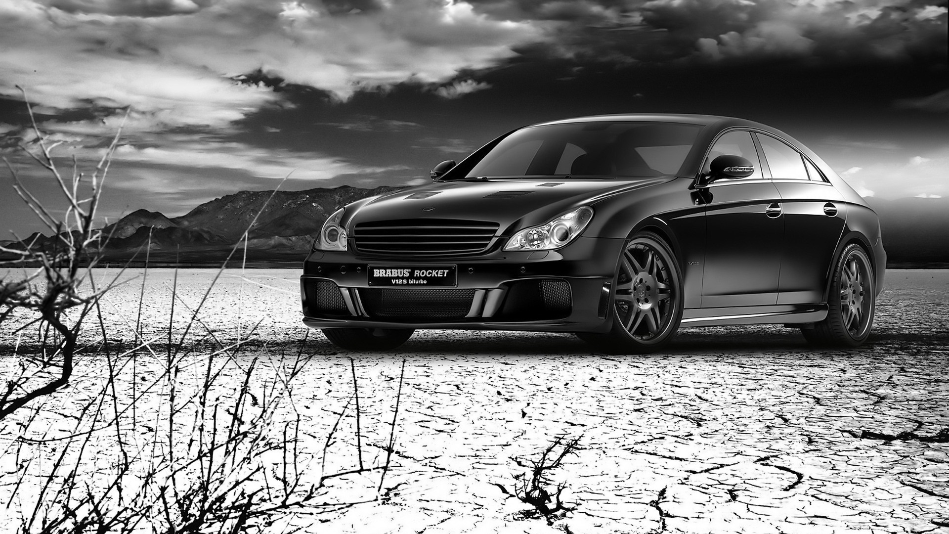 Description: A black car parked on a dry field under a cloudy sky with mountains in the background and a lake in the foreground.