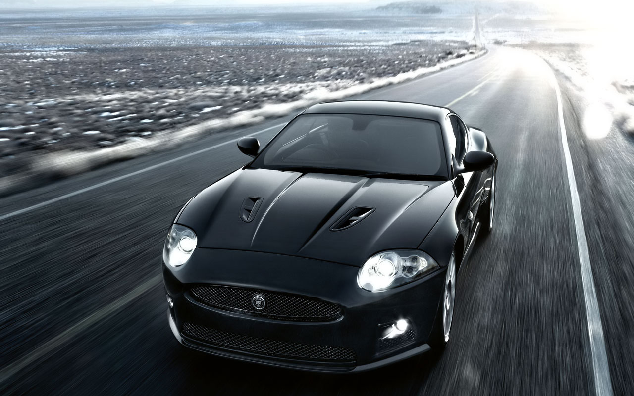 Description: A black car driving down a highway next to a mountain range in the sun with fog coming off the windshield.