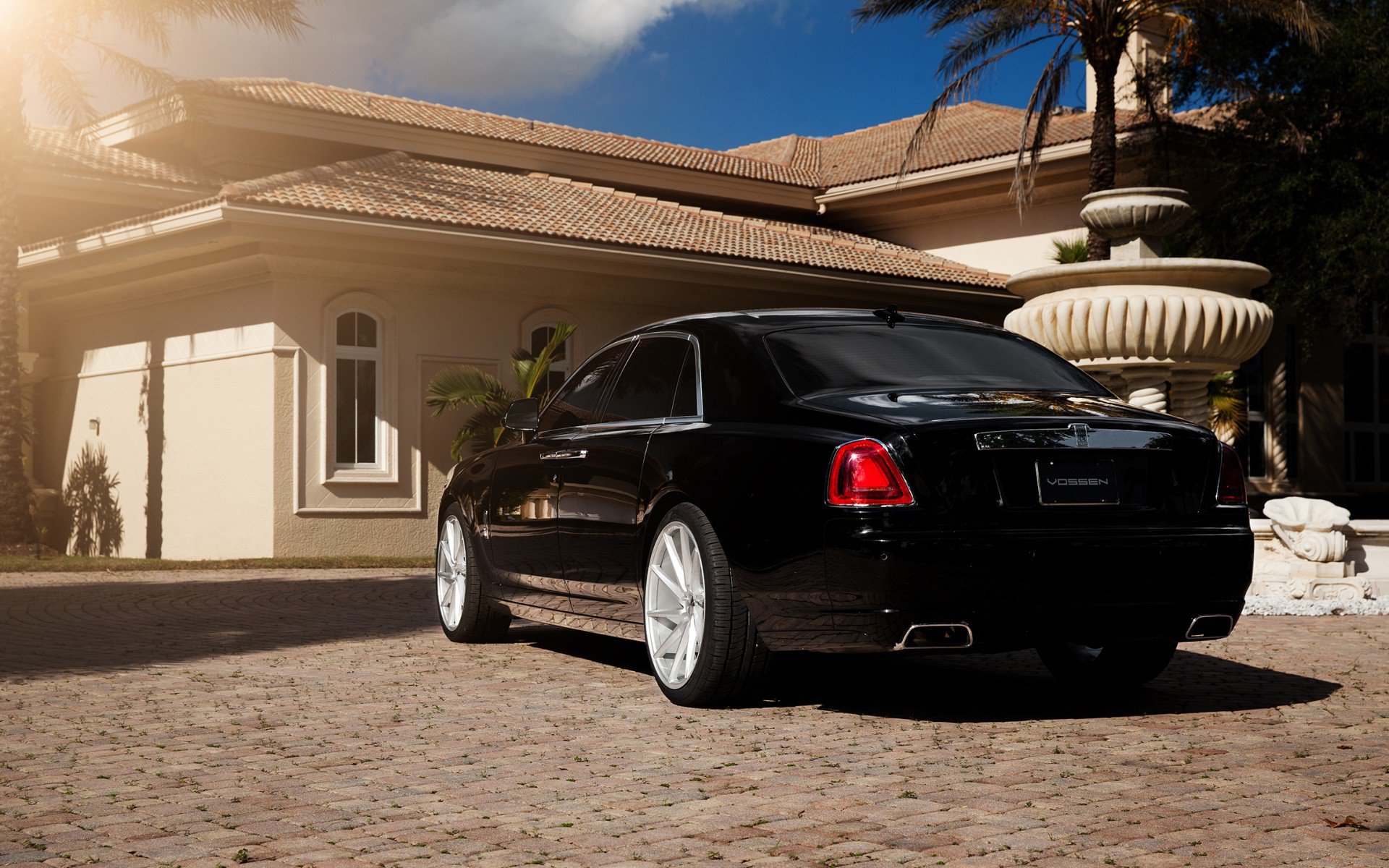 Description: A black car parked in front of a house with a fountain in the background and a palm tree in the foreground.