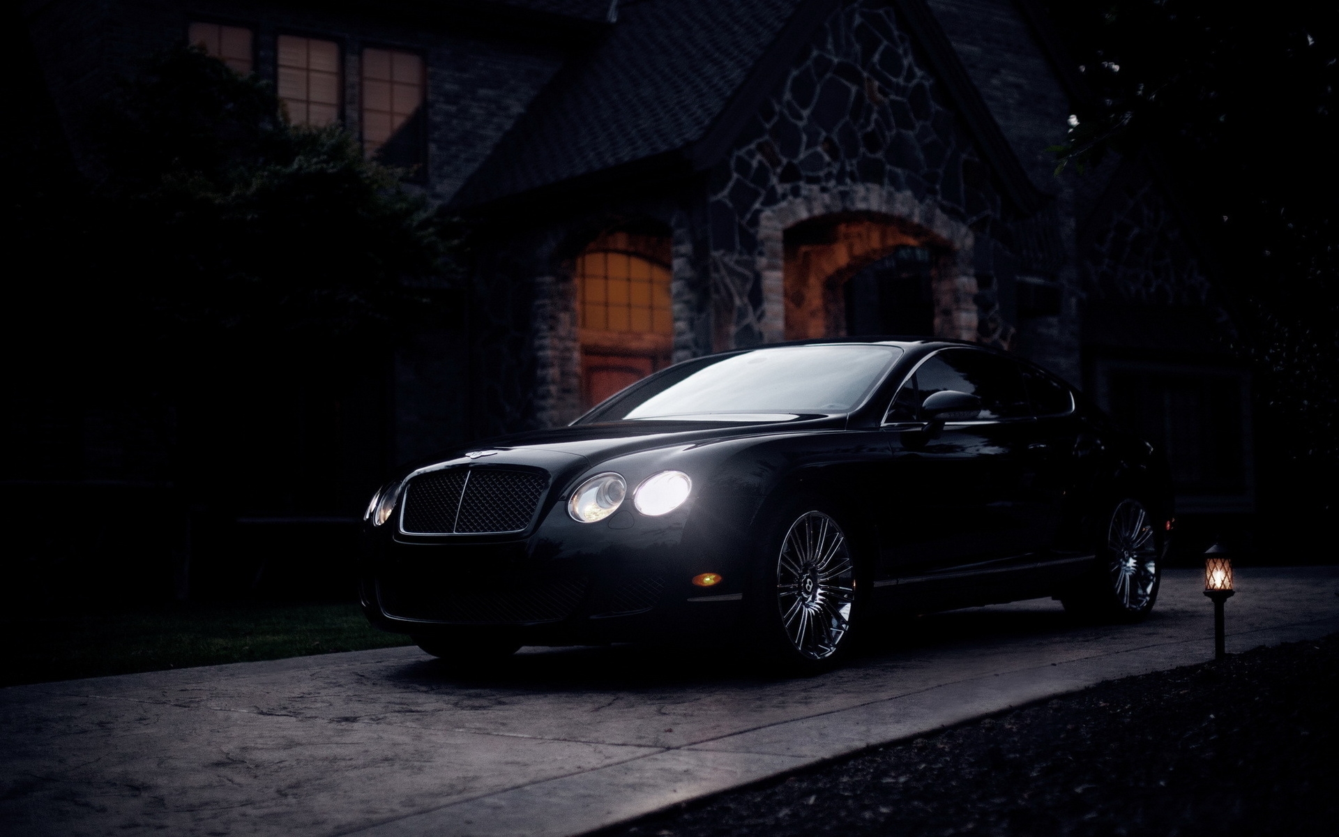 Description: A black car parked in front of a house at night with a lit candle in the driveway area of the car.