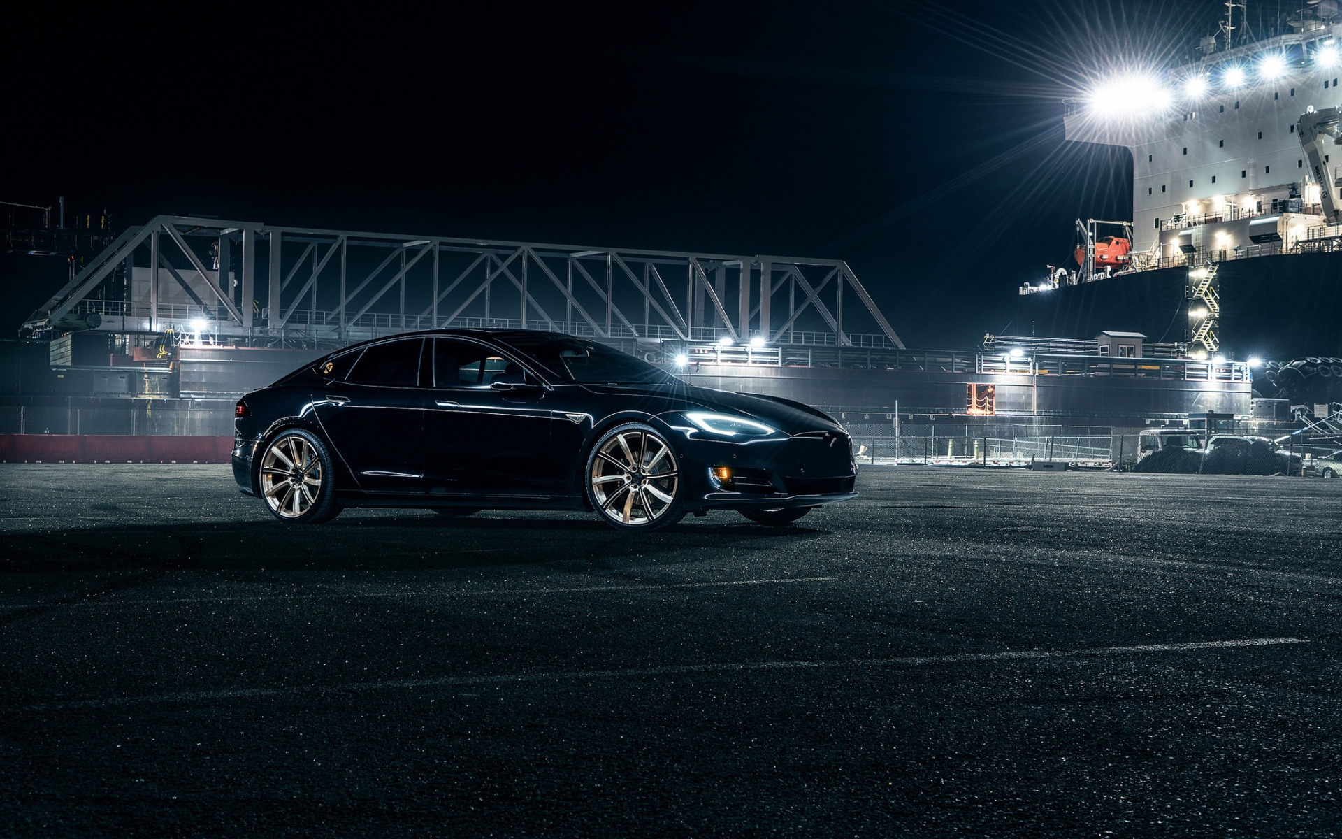 Description: A black car parked in a parking lot at night with a large ship in the background at night time.