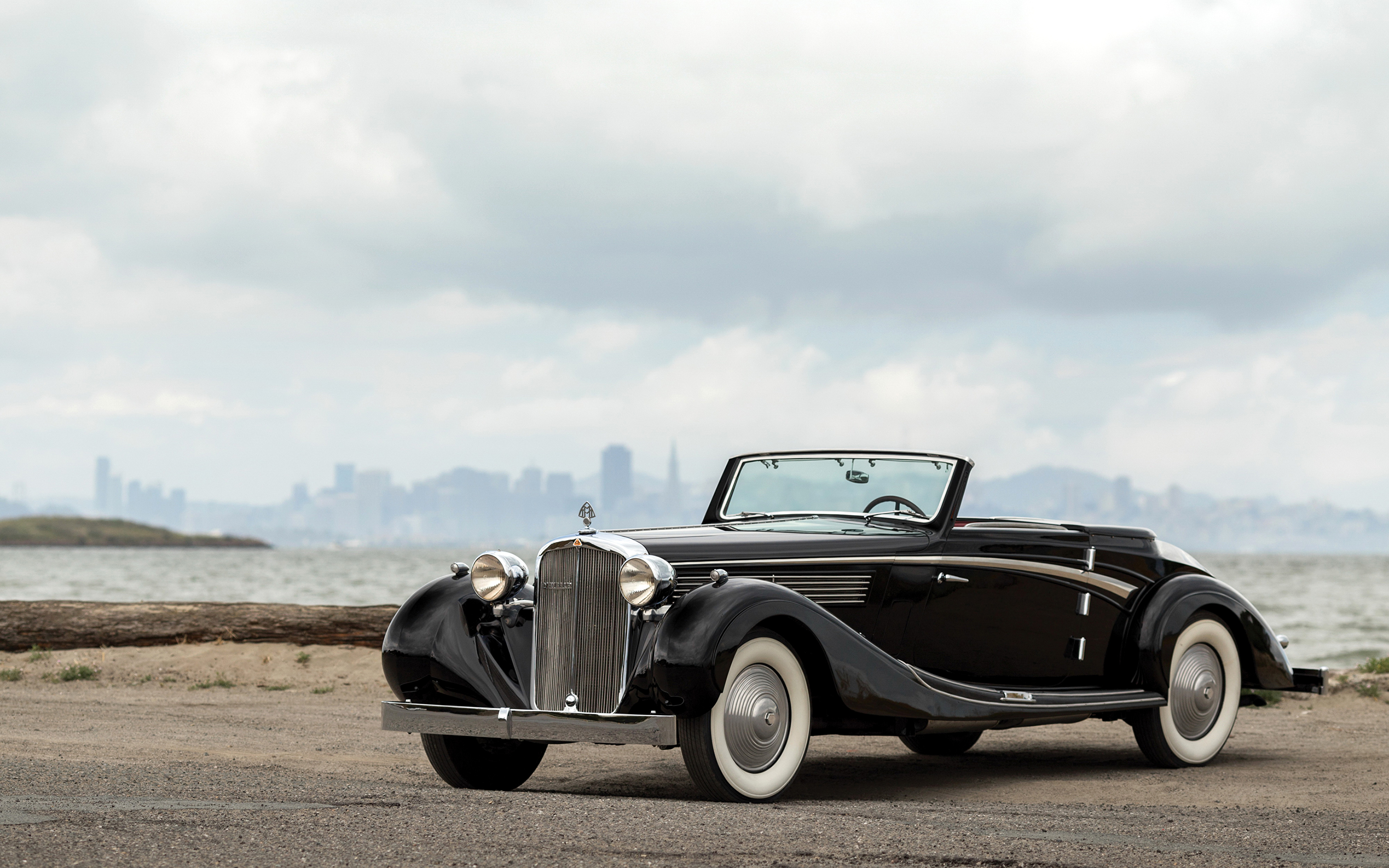 Description: A black car parked on the side of a road near the ocean and a city skyline in the background.