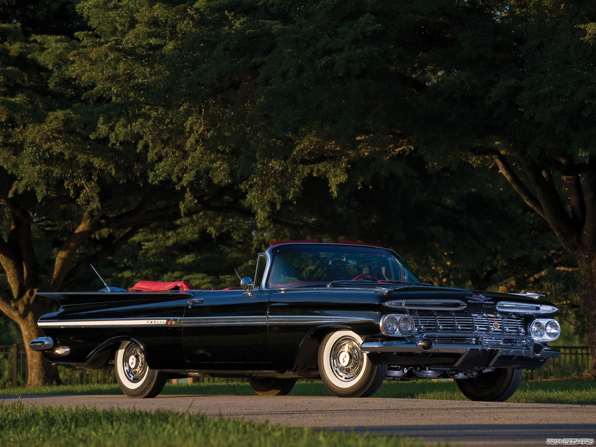 Description: A black car parked on the side of a road next to a forest of trees and grass with a red top.