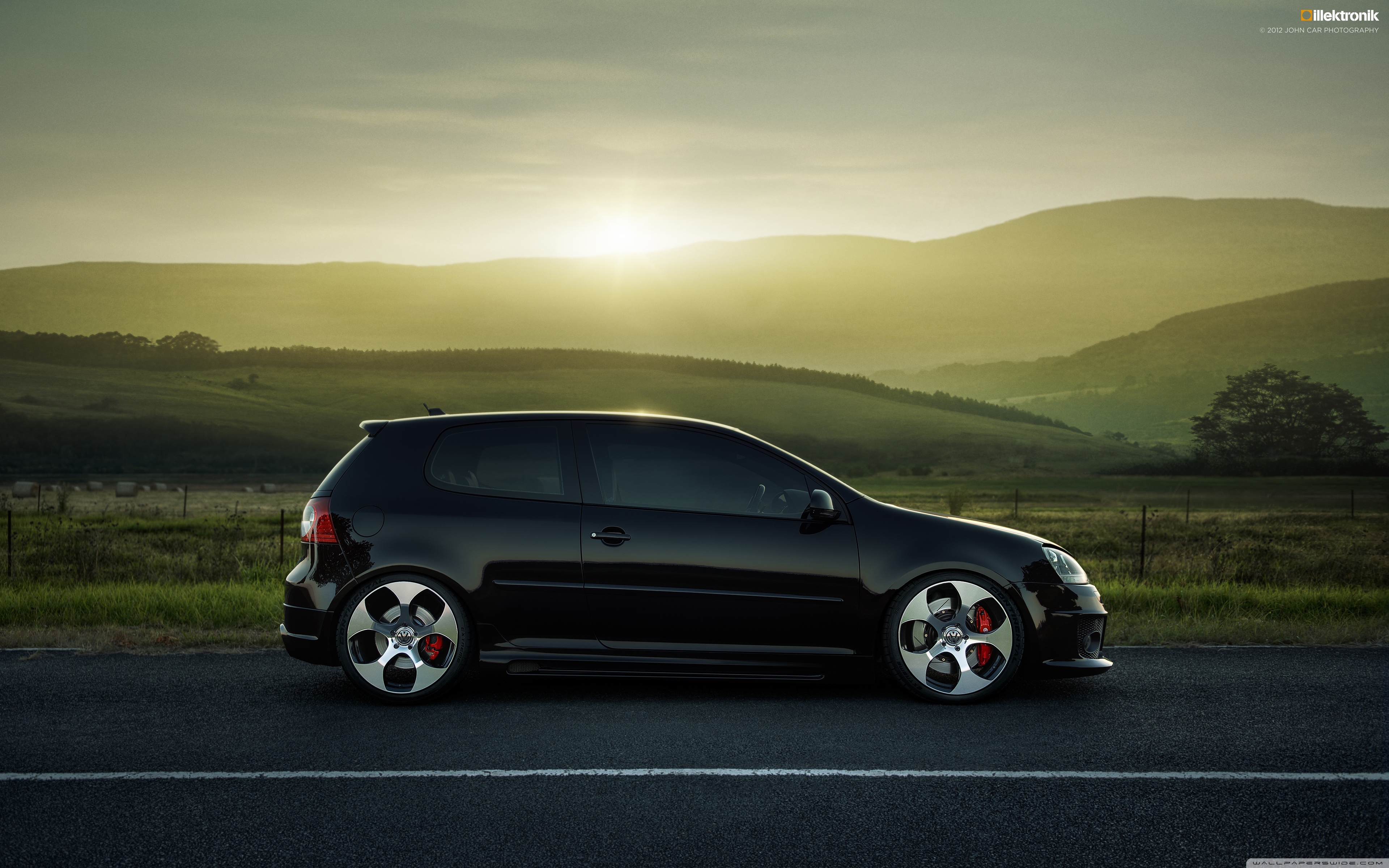 Description: A black car parked on the side of a road near a field of grass and mountains in the background.