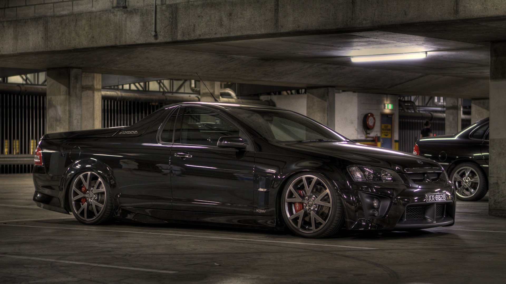 Description: A black car parked in a parking garage next to a building with a parking meter on the side of it.