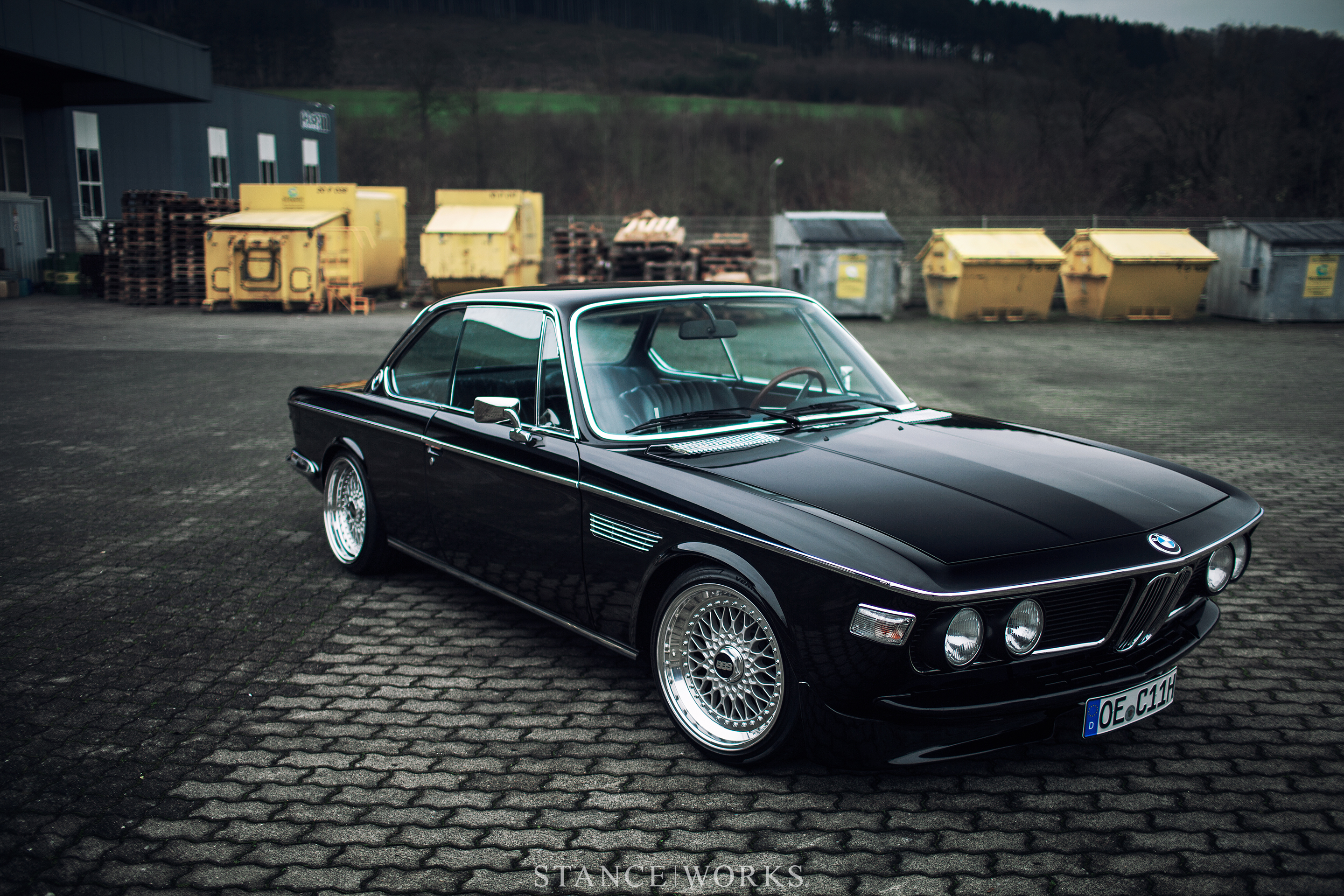 Description: A black car parked in a parking lot next to a pile of boxes and a building with a large amount of windows.