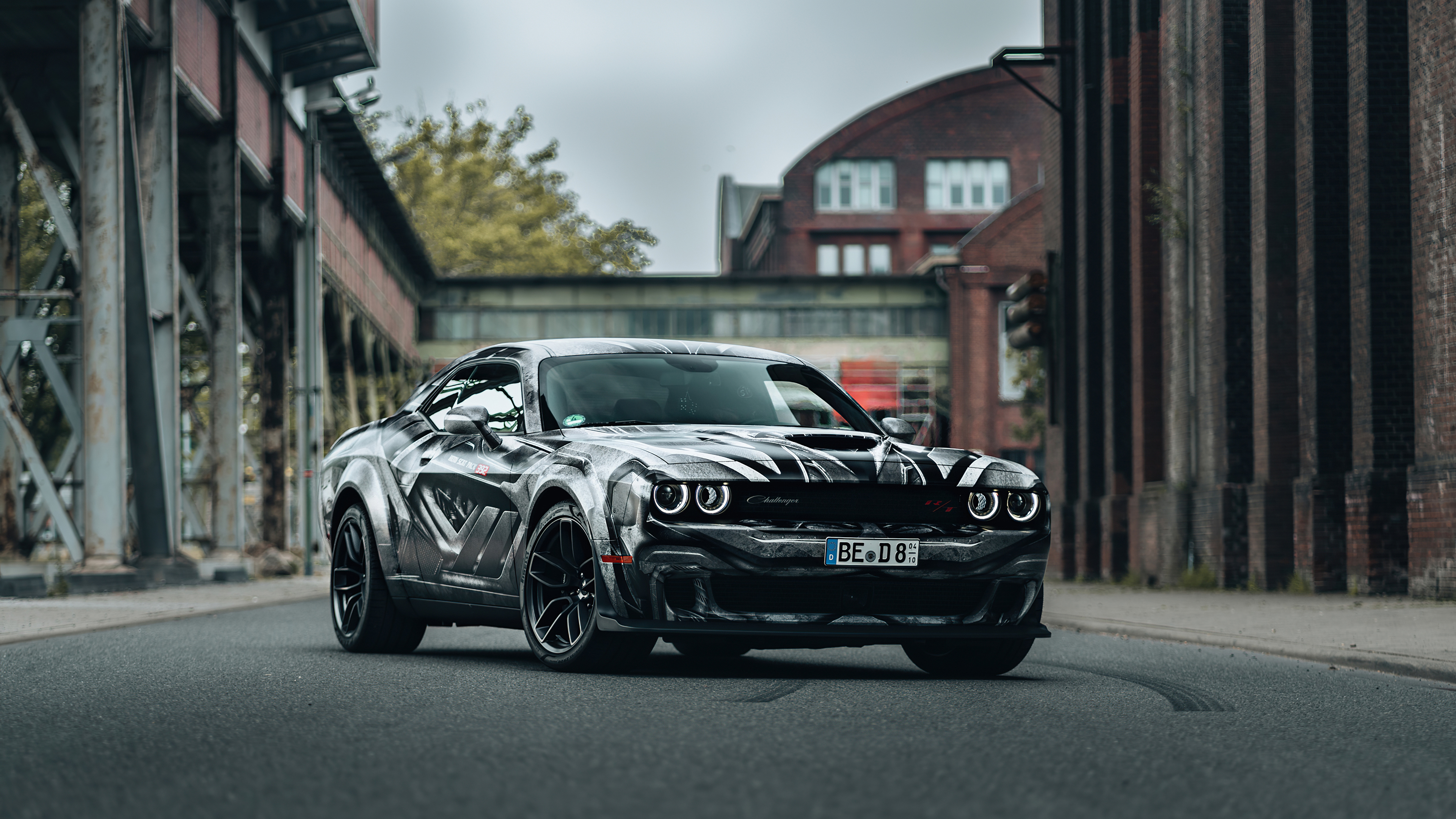 Description: A black car parked on the side of a road near a building with a bridge in the background and a red car parked on the side of the road.
