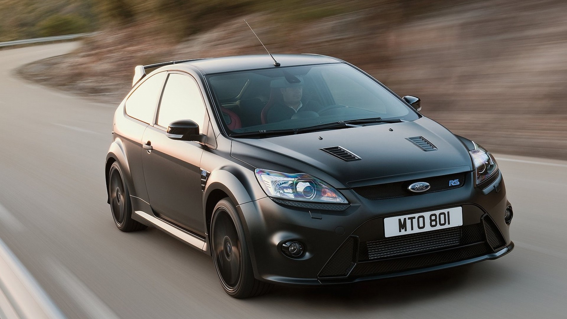 Description: A black car driving down a road next to a forest of trees and bushes on a sunny day with a blurry background.