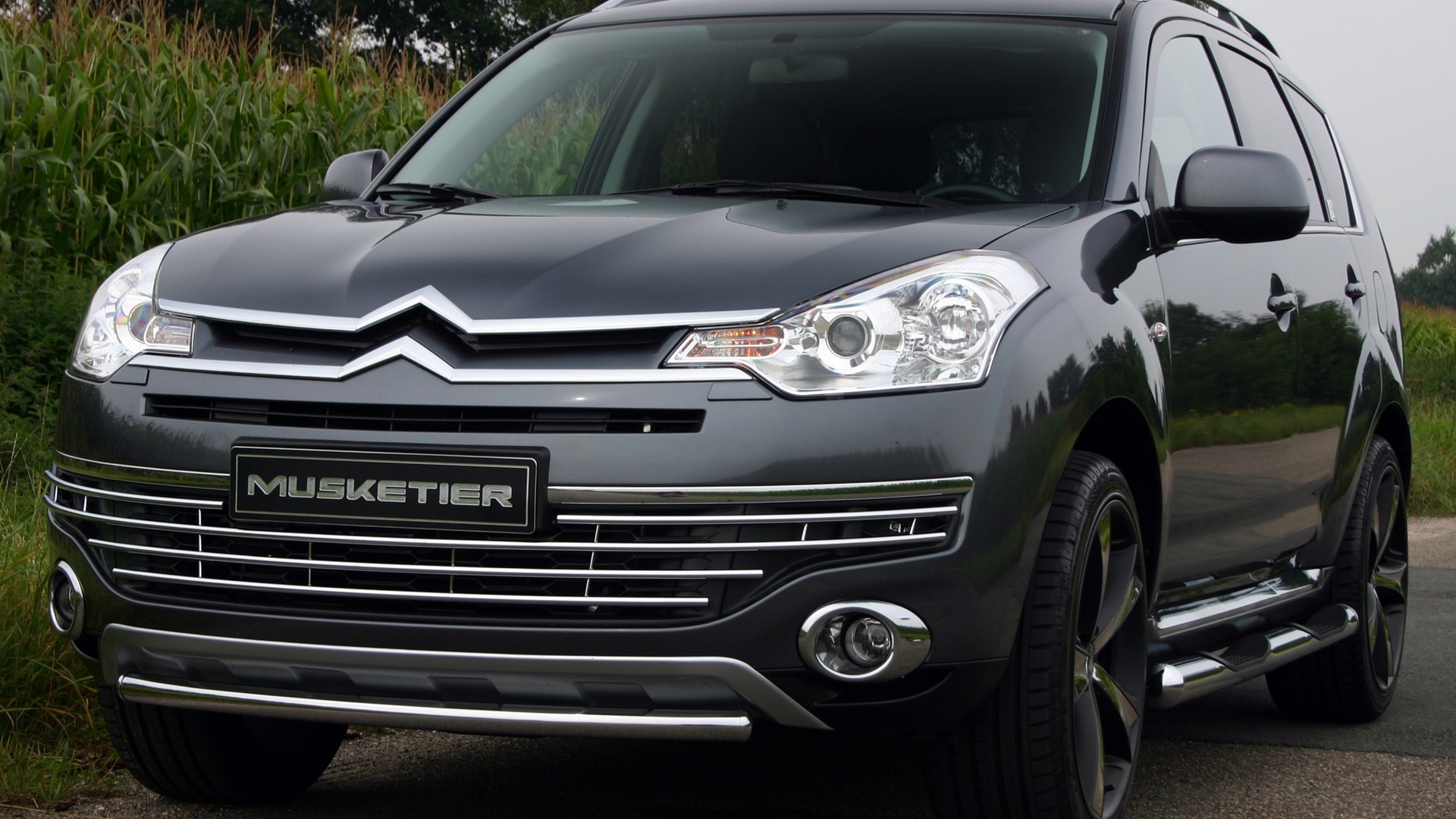 Description: A black car parked on the side of a road near a field of grass and trees with a sky background.