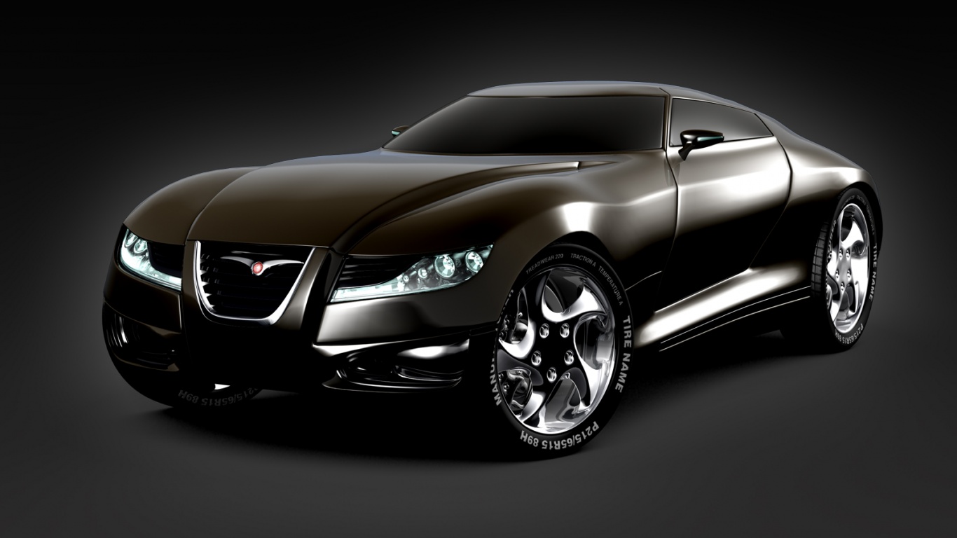 Description: A black car with a shiny hood and chrome rims on it's wheels and tires is shown.