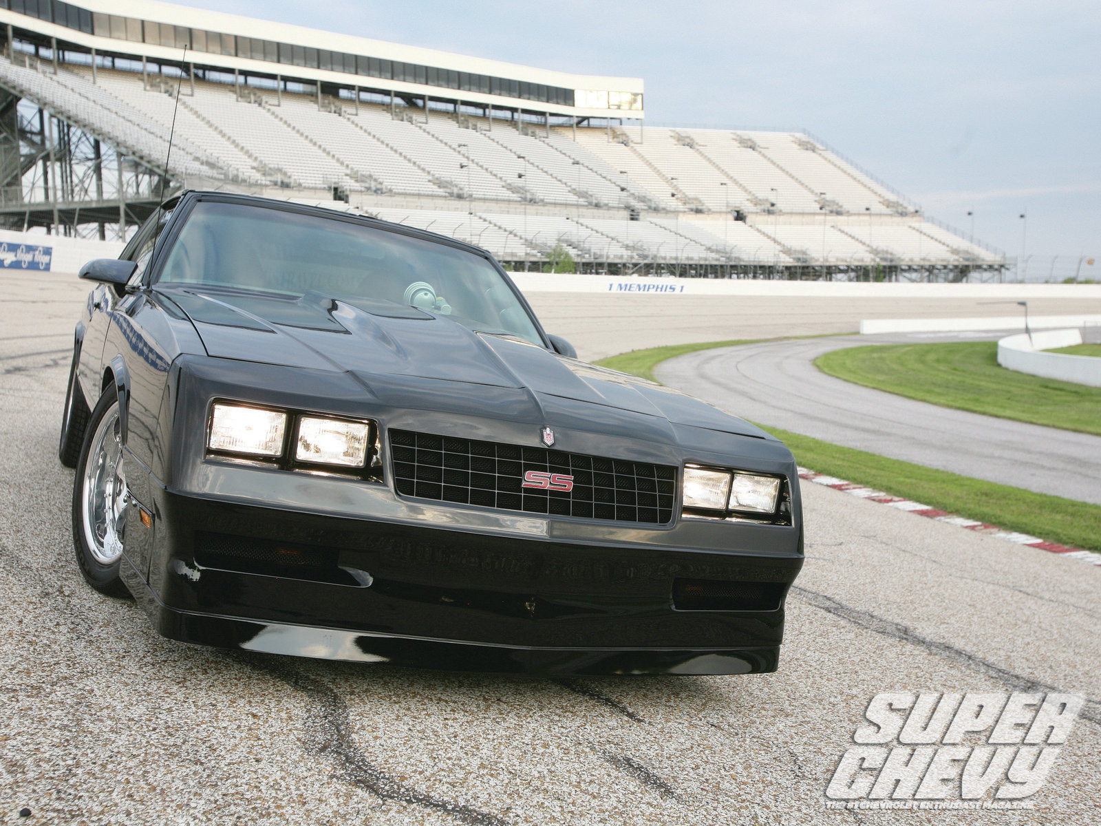 Description: A black car parked in front of a stadium bleachers and a track with a car in the background.
