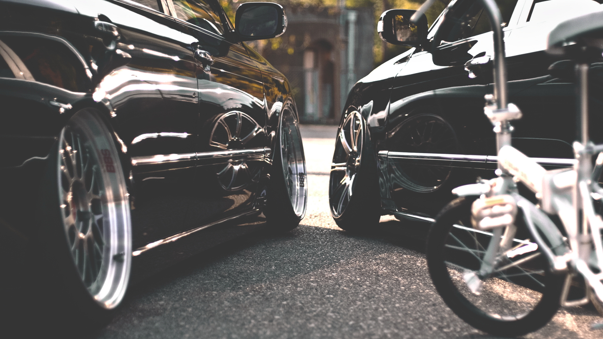 Description: A pair of black cars parked next to each other on a street with a bike parked next to them.