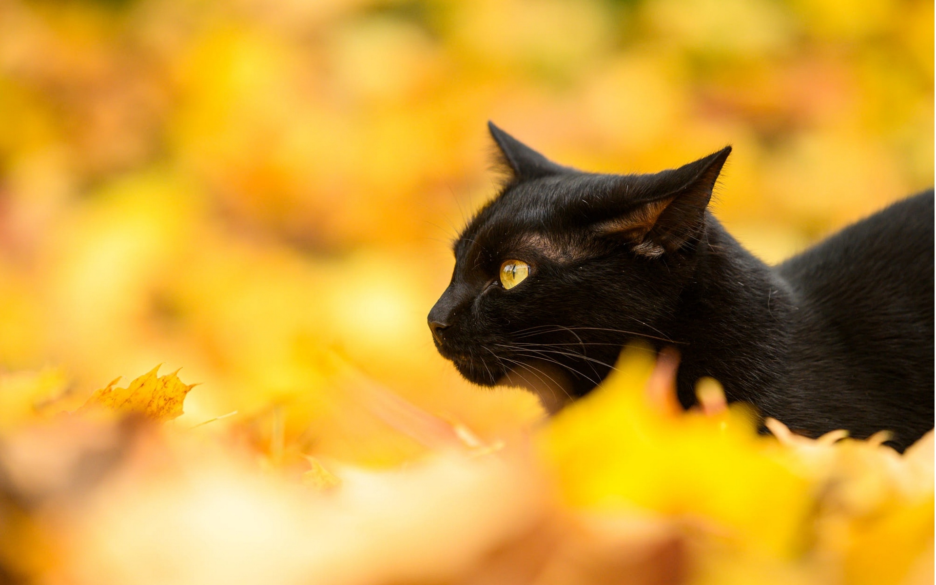 Description: A black cat is sitting in a field of leaves and looking at something with a curious look on its face.