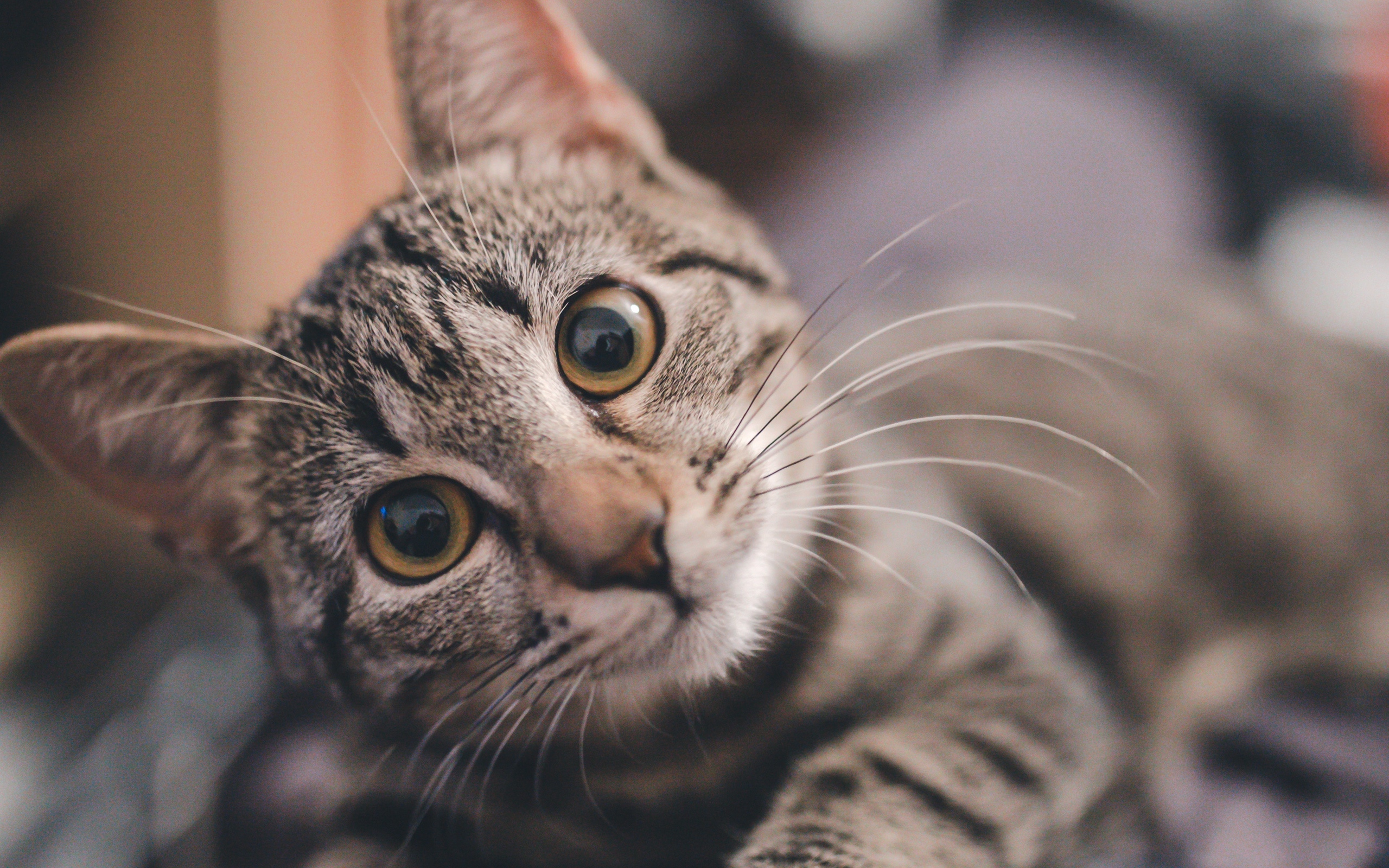 Description: A cat laying on top of a bed next to a pillow and a blanket on the floor with a blurry background.