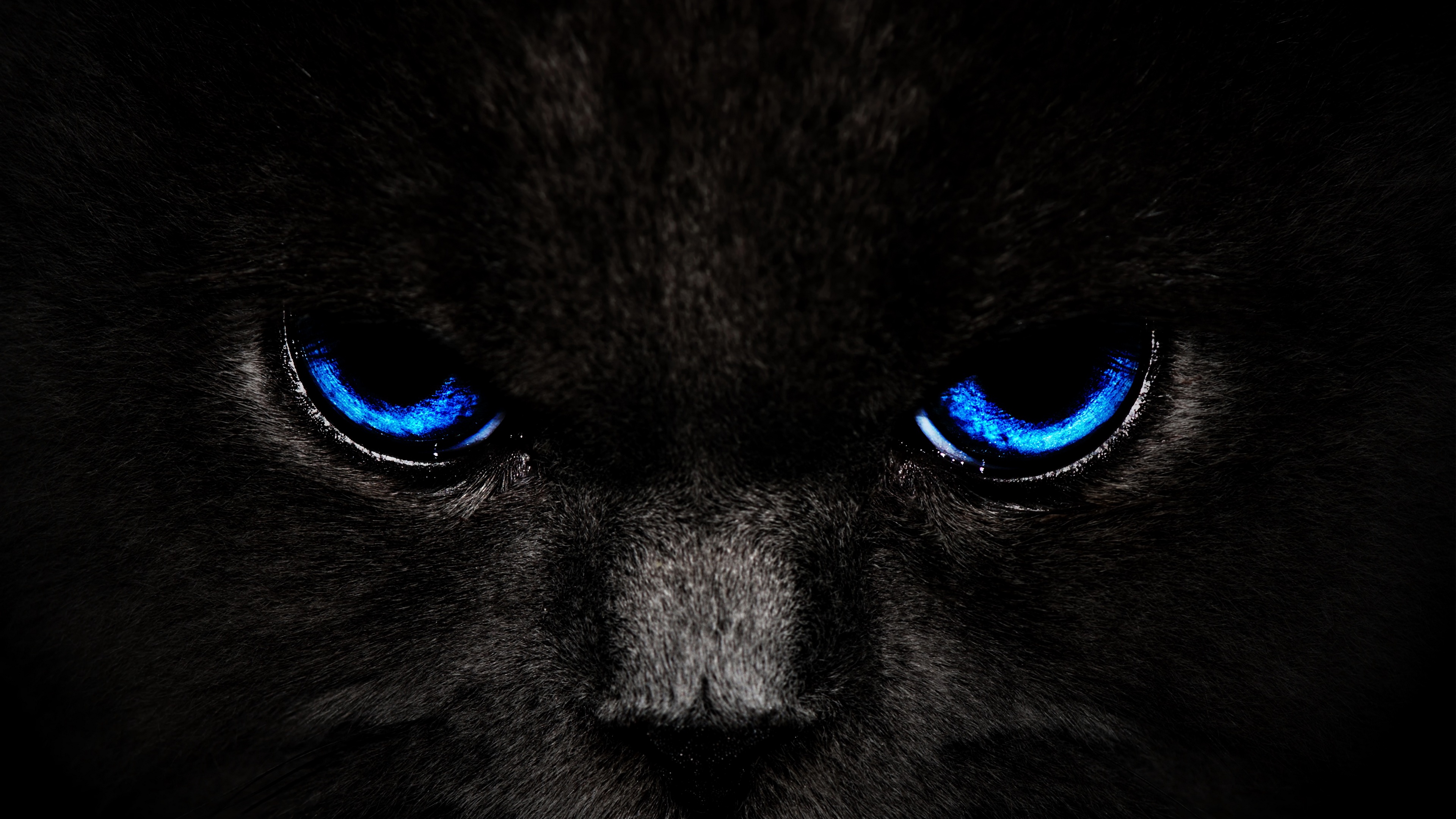 Description: A black cat with blue eyes looks at the camera with a serious look on its face.