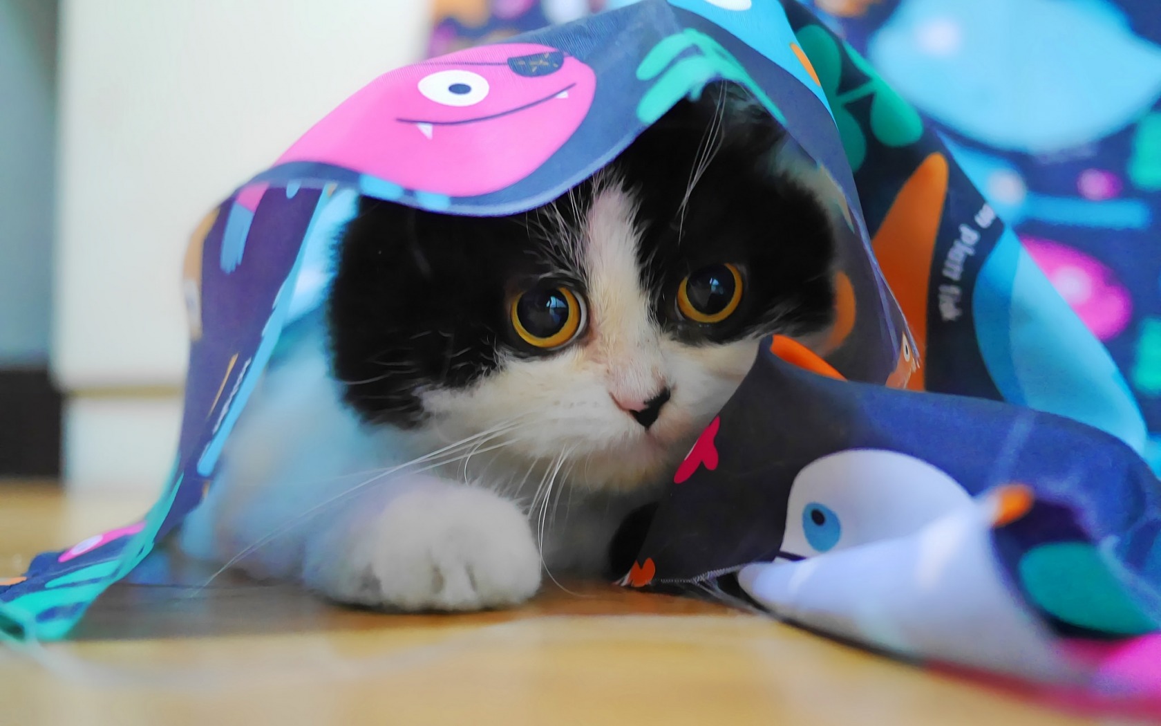 Description: A cat hiding in a bag with a stuffed animal inside of it on the floor of a room with a wooden floor.