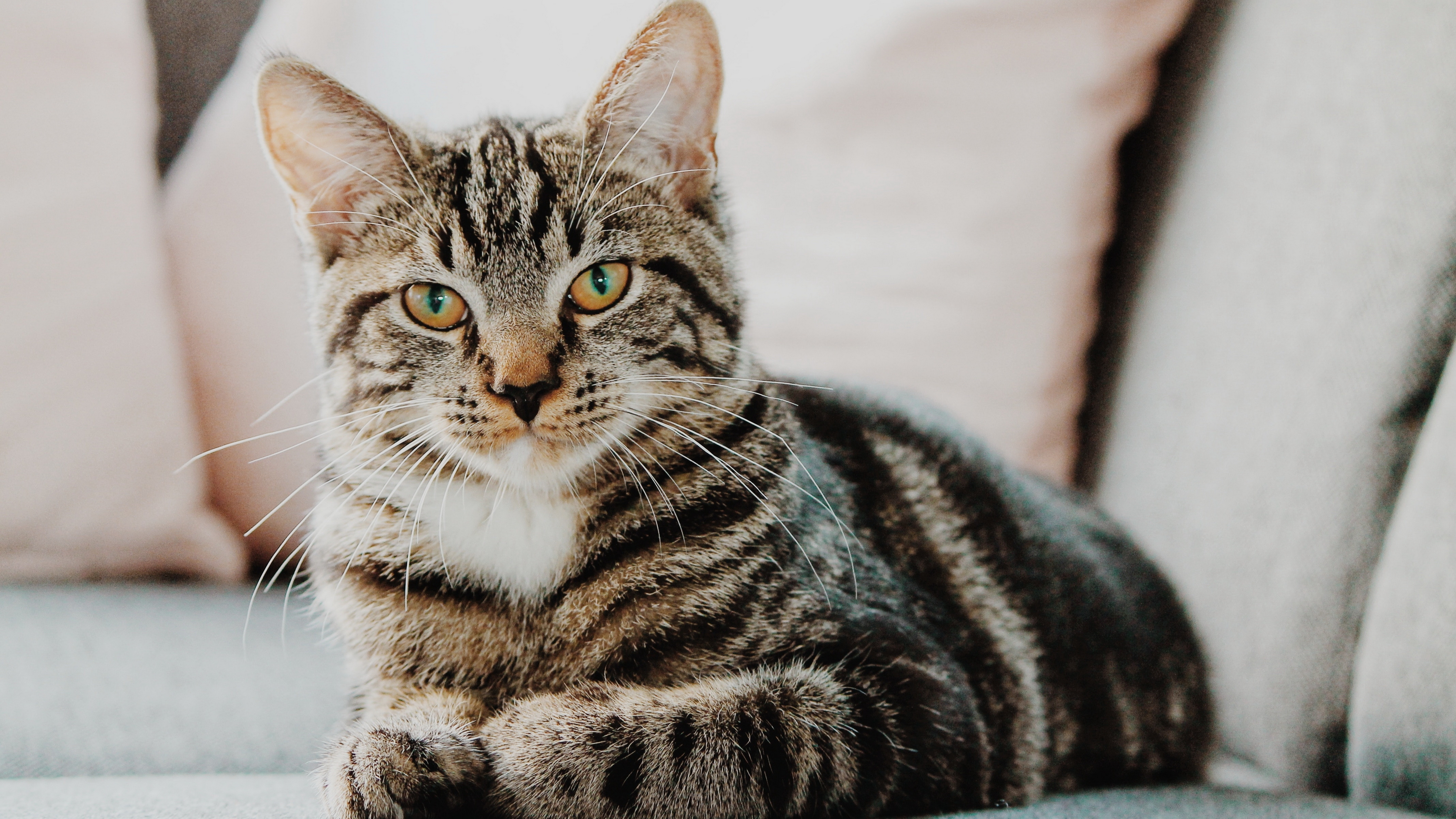 Description: A cat sitting on a couch with a pink pillow behind it and a pink pillow behind it that has a white stripe on the front of the cat.