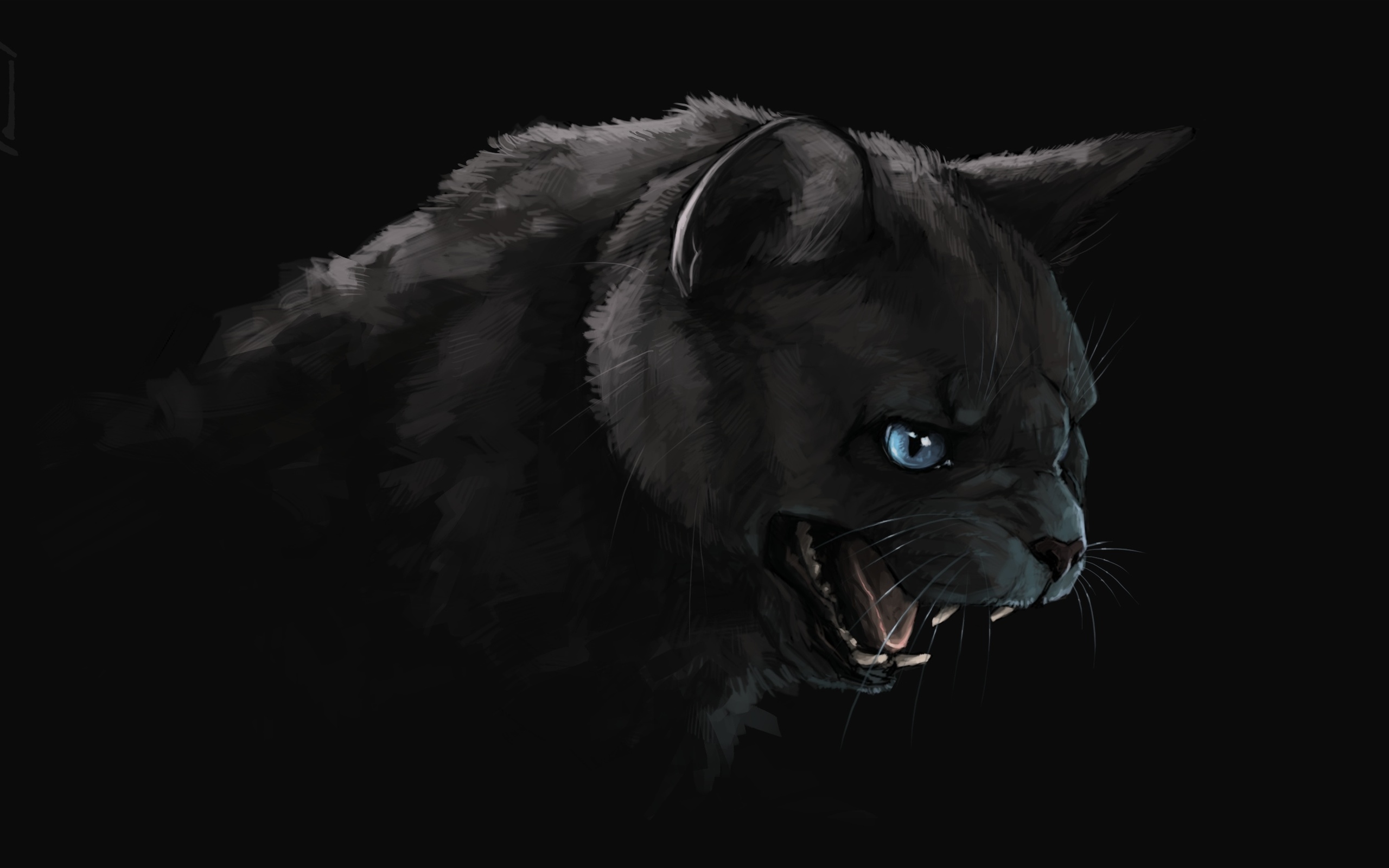 Description: A black cat with blue eyes and a snarling face on a black background with a black background and a black background with a black background.