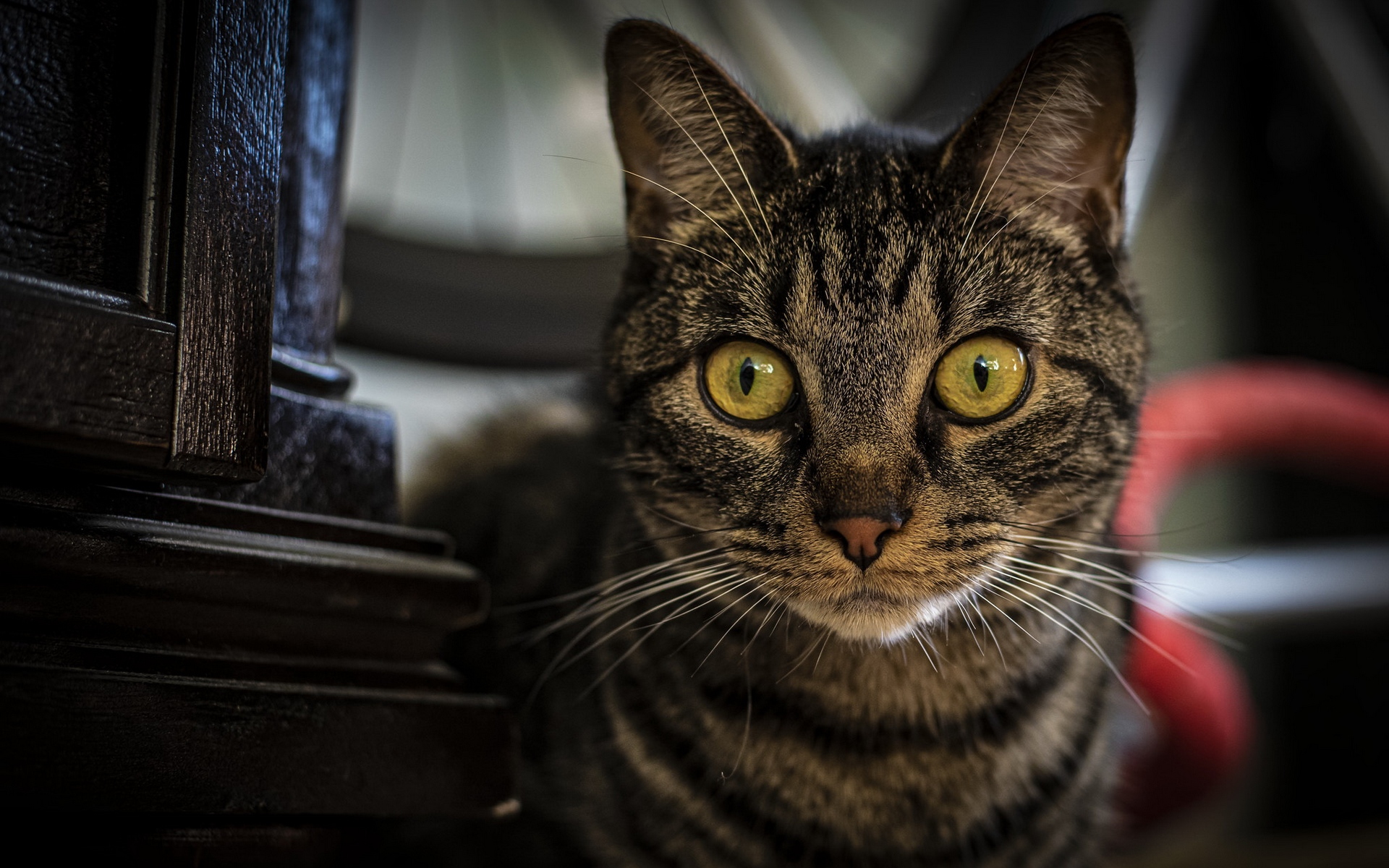Description: A cat sitting on the floor next to a clock and a red cord on a table and a black chair.