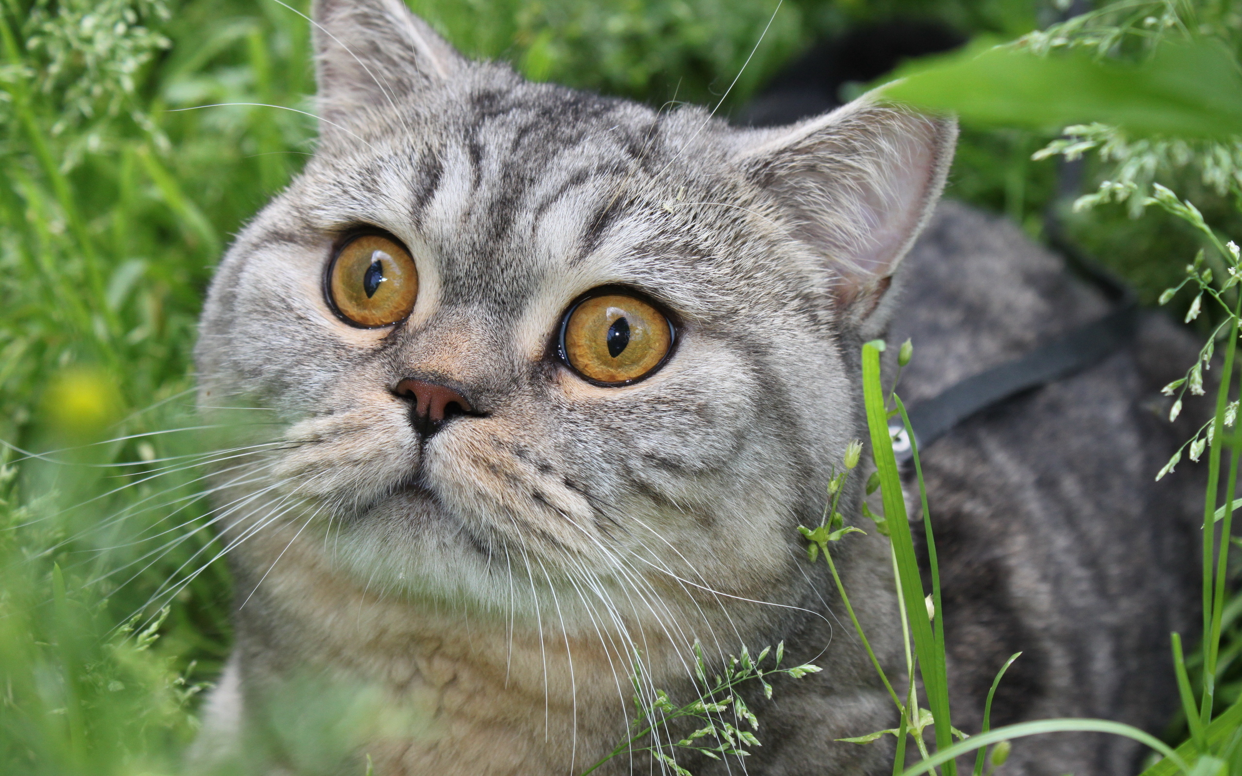 Description: A cat is looking up while standing in the grass and flowers in the background is a black cat with yellow eyes.
