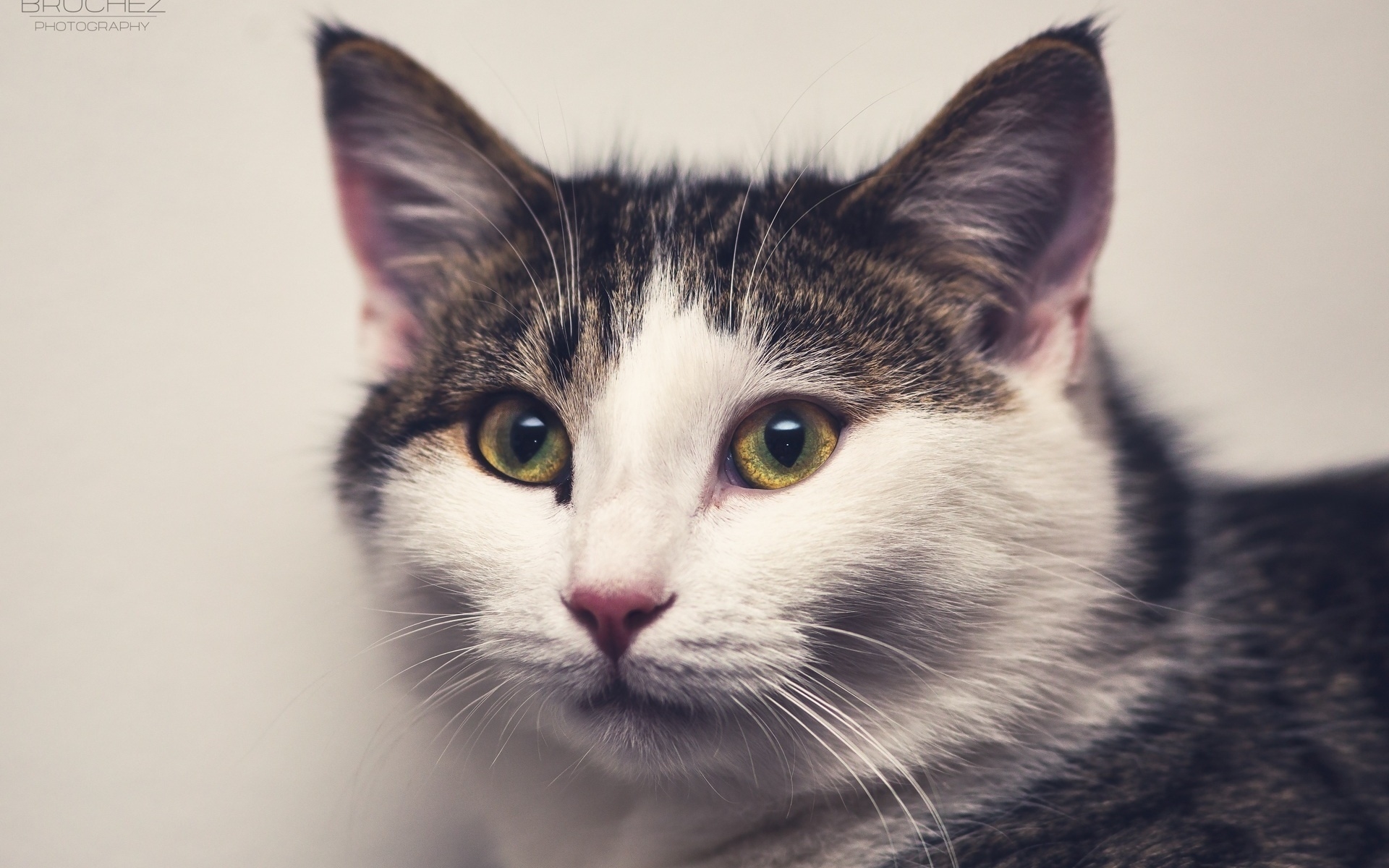 Description: A cat with green eyes looking at the camera with a white background and a white wall behind it and a white wall behind it.
