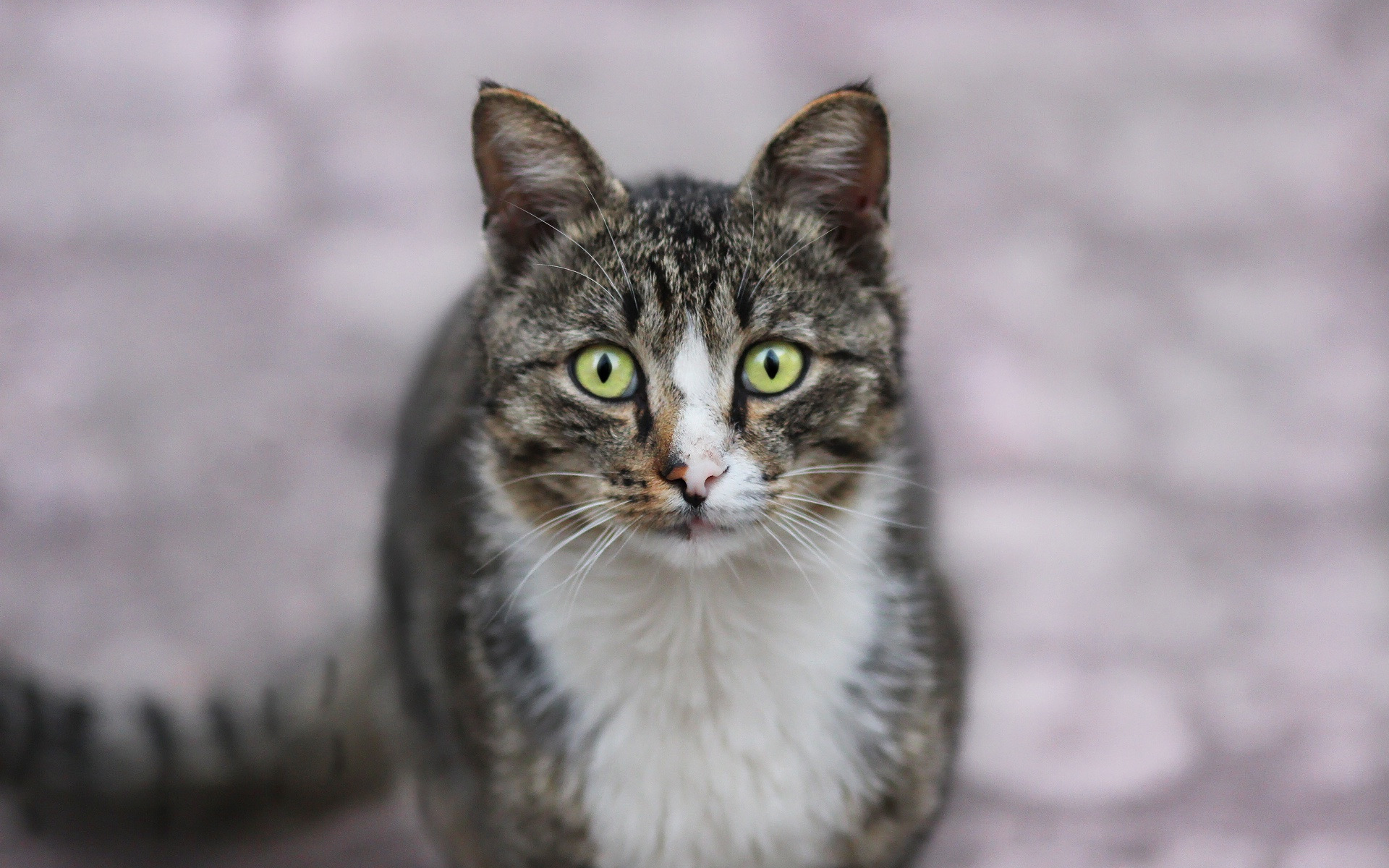 Description: A cat with green eyes looking up at the camera with a blurry background behind it and a white spot on the right side of the cat's face.