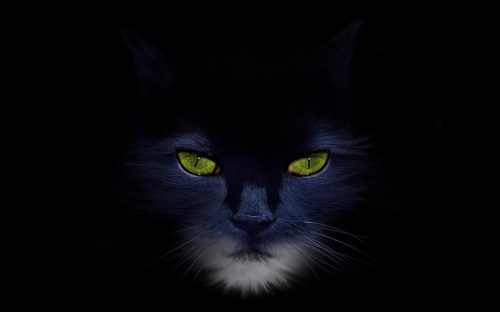Description: A black cat with green eyes in the dark with a black background and a white spot on the left side of the face.