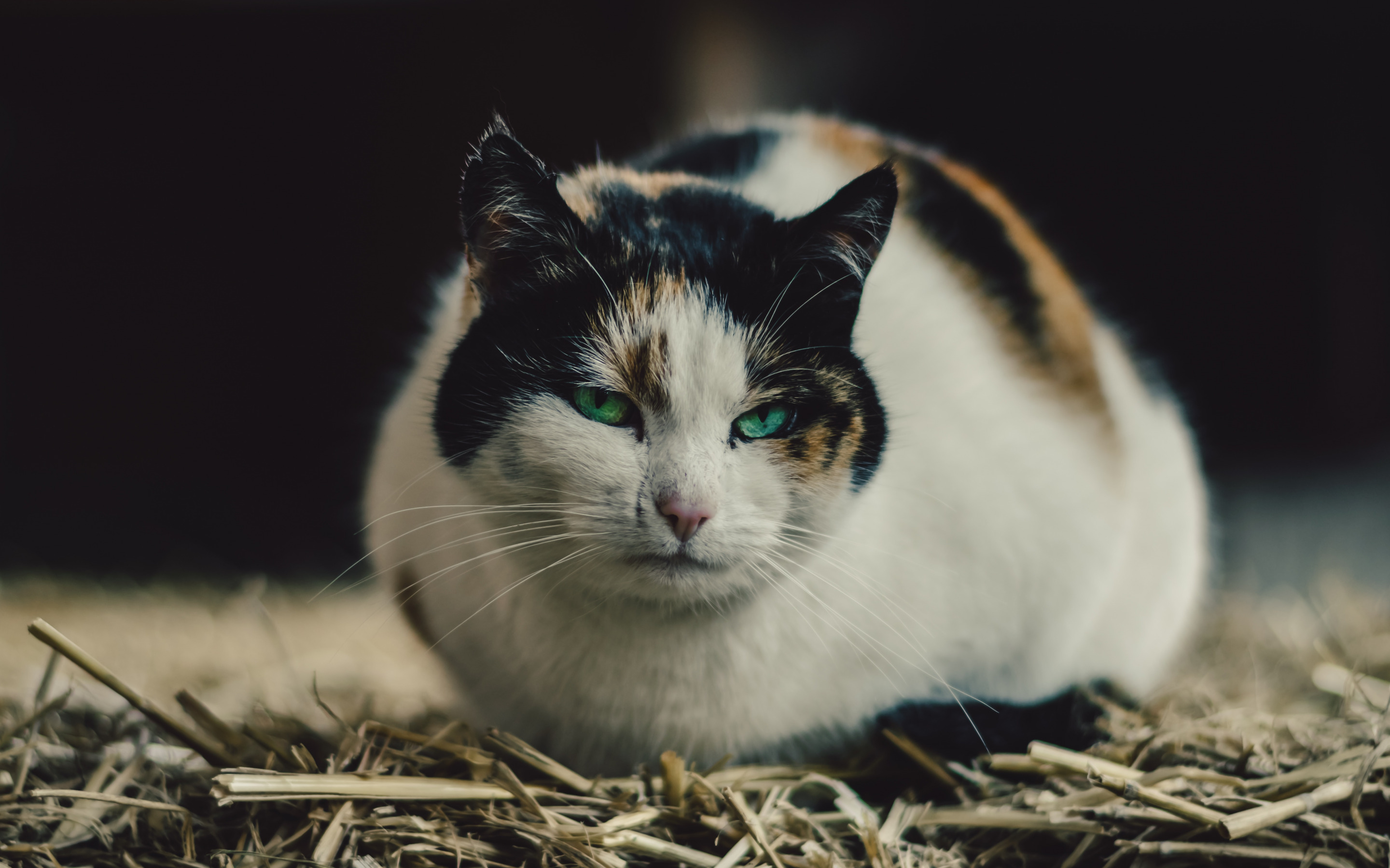 Description: A cat with green eyes sitting on the ground in hay looking at the camera with a serious look on its face.