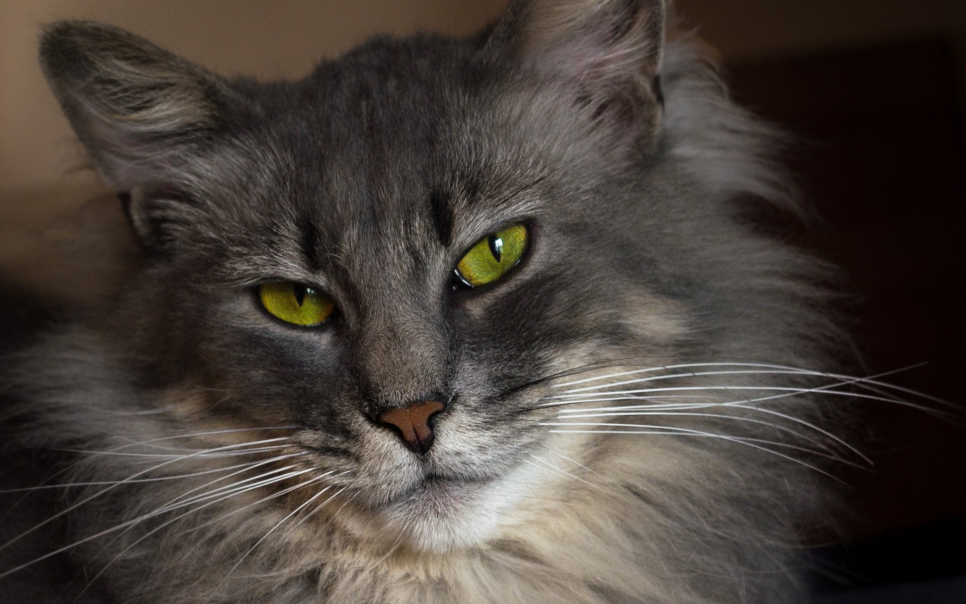 Description: A cat with green eyes looking at the camera with a serious look on its face and chest.
