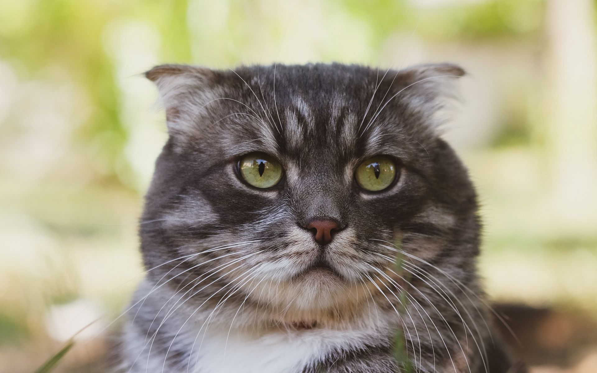 Description: A cat with green eyes sitting in the grass looking at the camera with a serious look on its face.