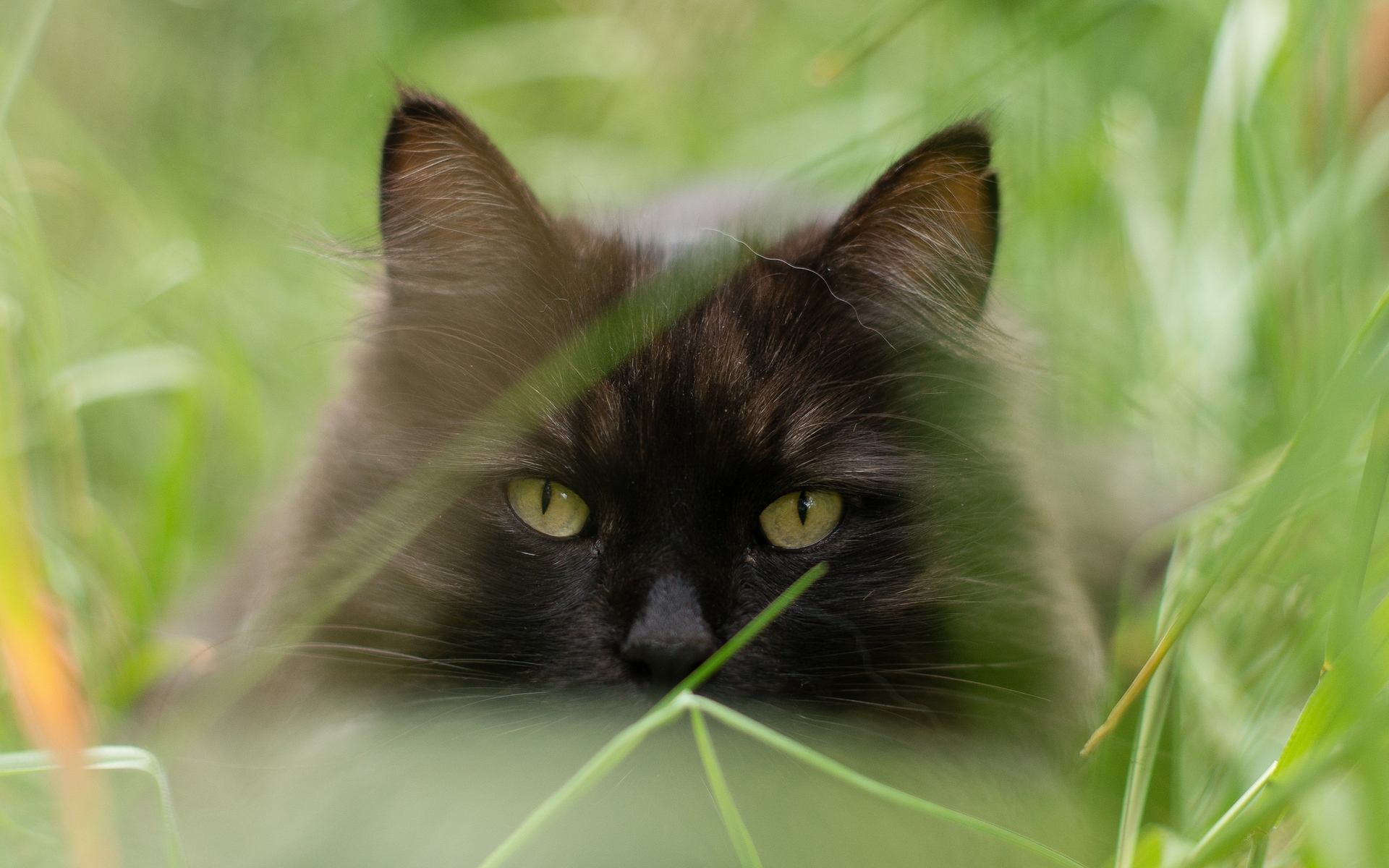 Description: A black cat with yellow eyes hiding in the grass with long grass in front of it and looking at the camera.