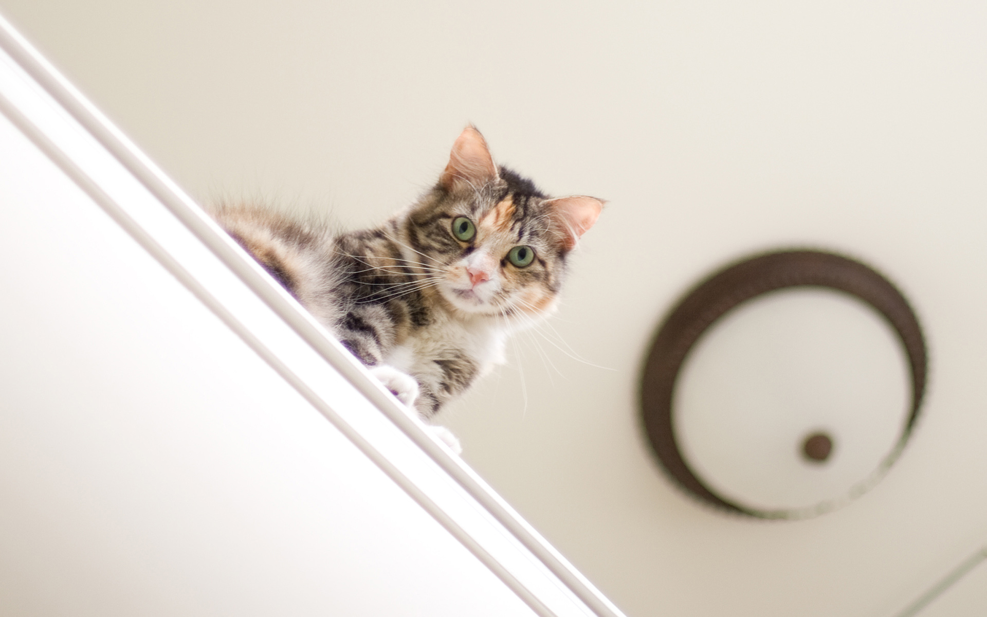 Description: A cat is looking at itself in the mirror of a bathroom mirror.