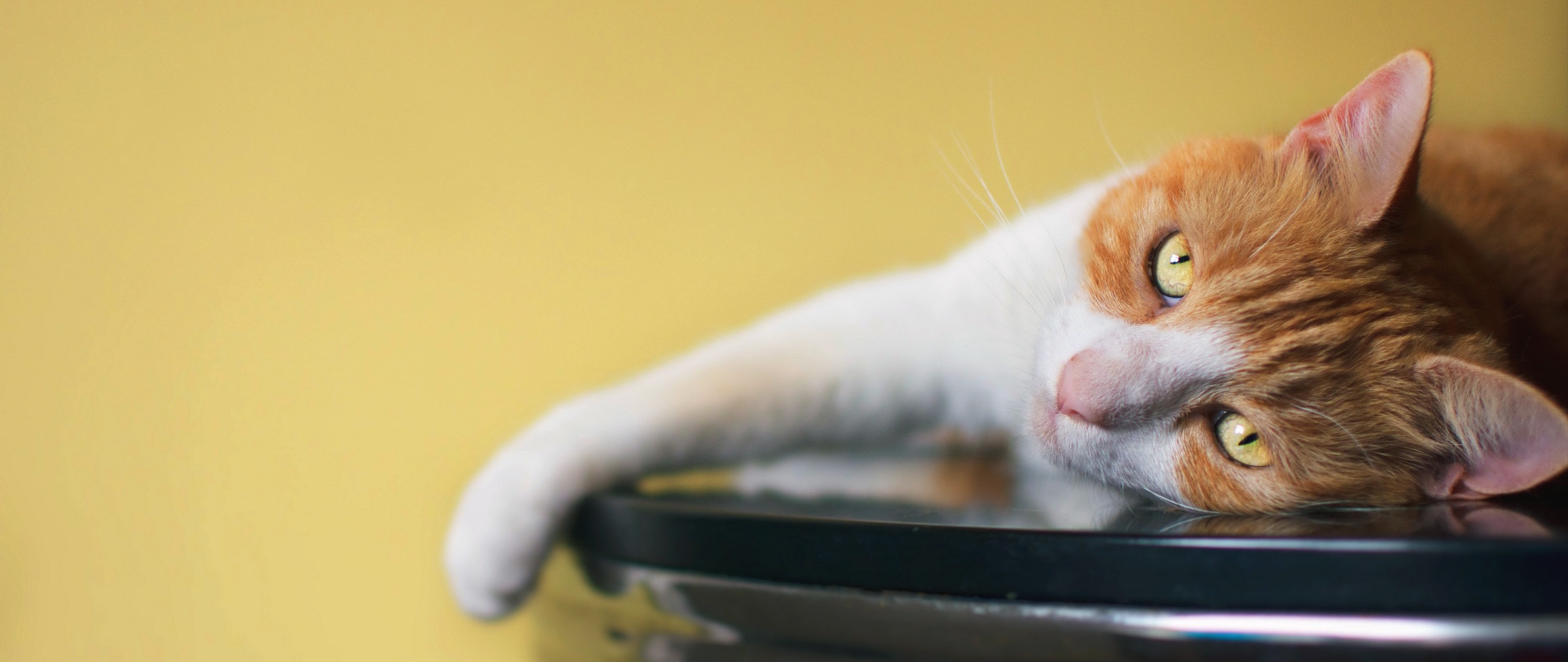 Description: A cat laying on top of a black bowl on a table next to a yellow wall and a yellow wall.