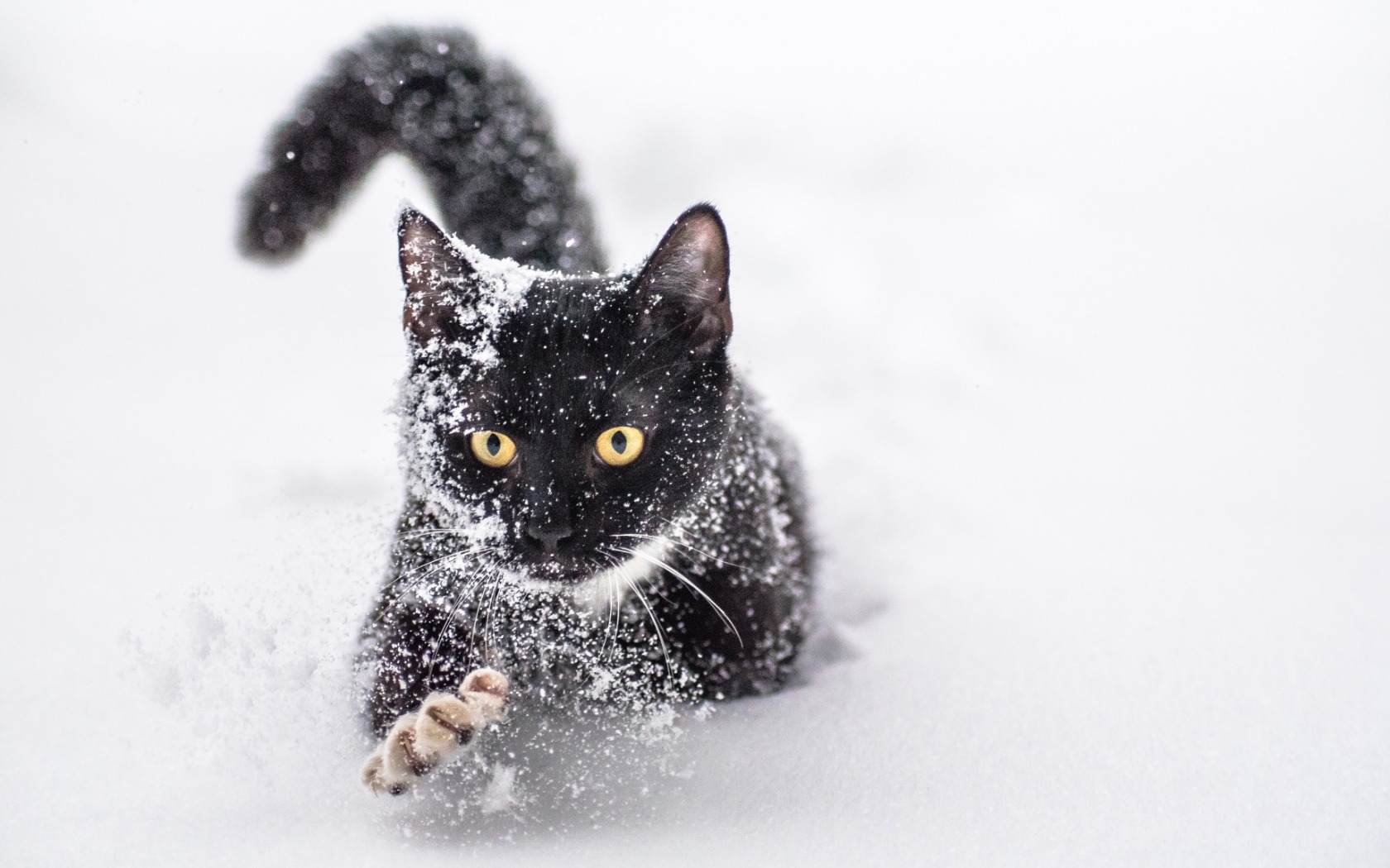 Description: A black cat is playing in the snow with a toy in its paws and it's eyes are yellow.