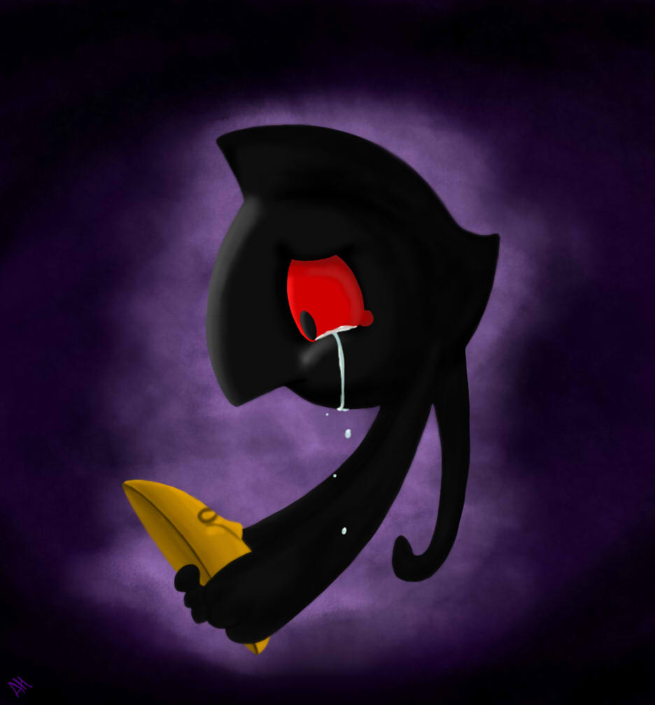 Description: A black cat with a red nose and a yellow banana in its mouth is floating in the air with a purple background.