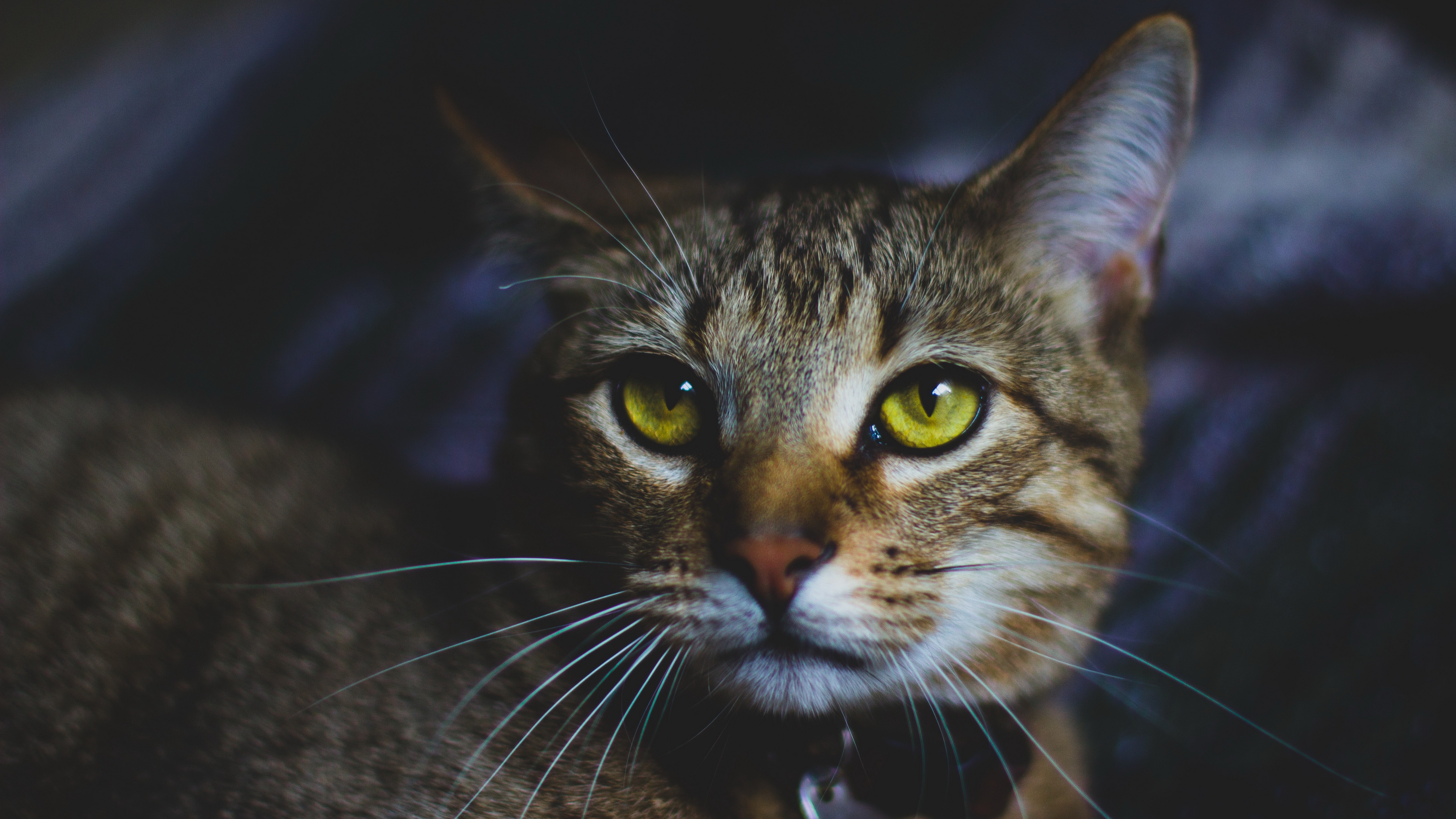 Description: A cat with yellow eyes looking at the camera with a serious look on its face and chest.