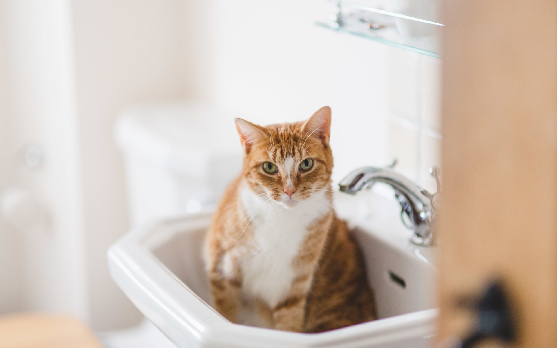 Description: A cat sitting in a bathroom sink with a mirror above it's head and a sink below it.