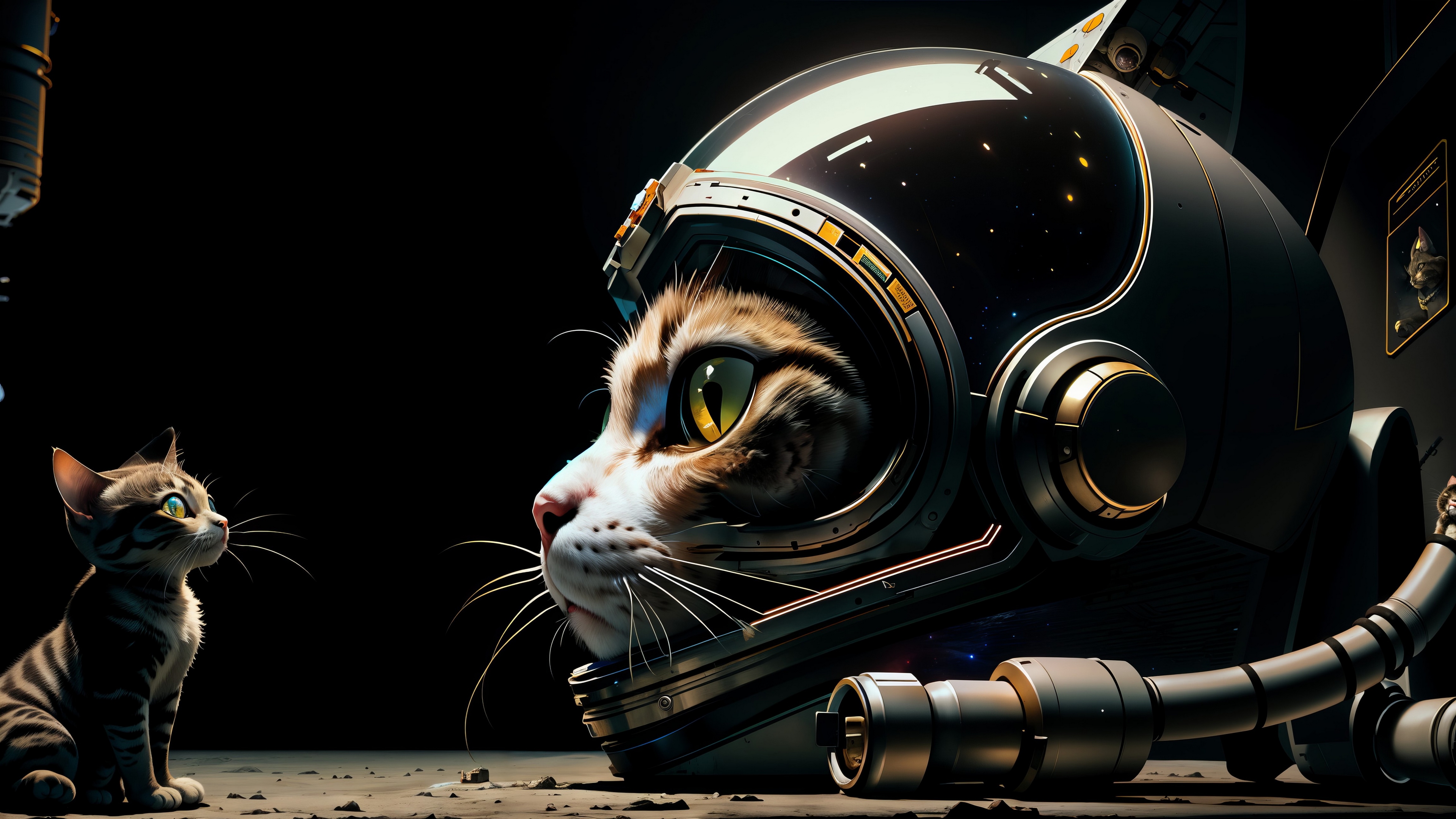 Description: A cat sitting next to a space suit and a cat looking at it's reflection in the mirror.