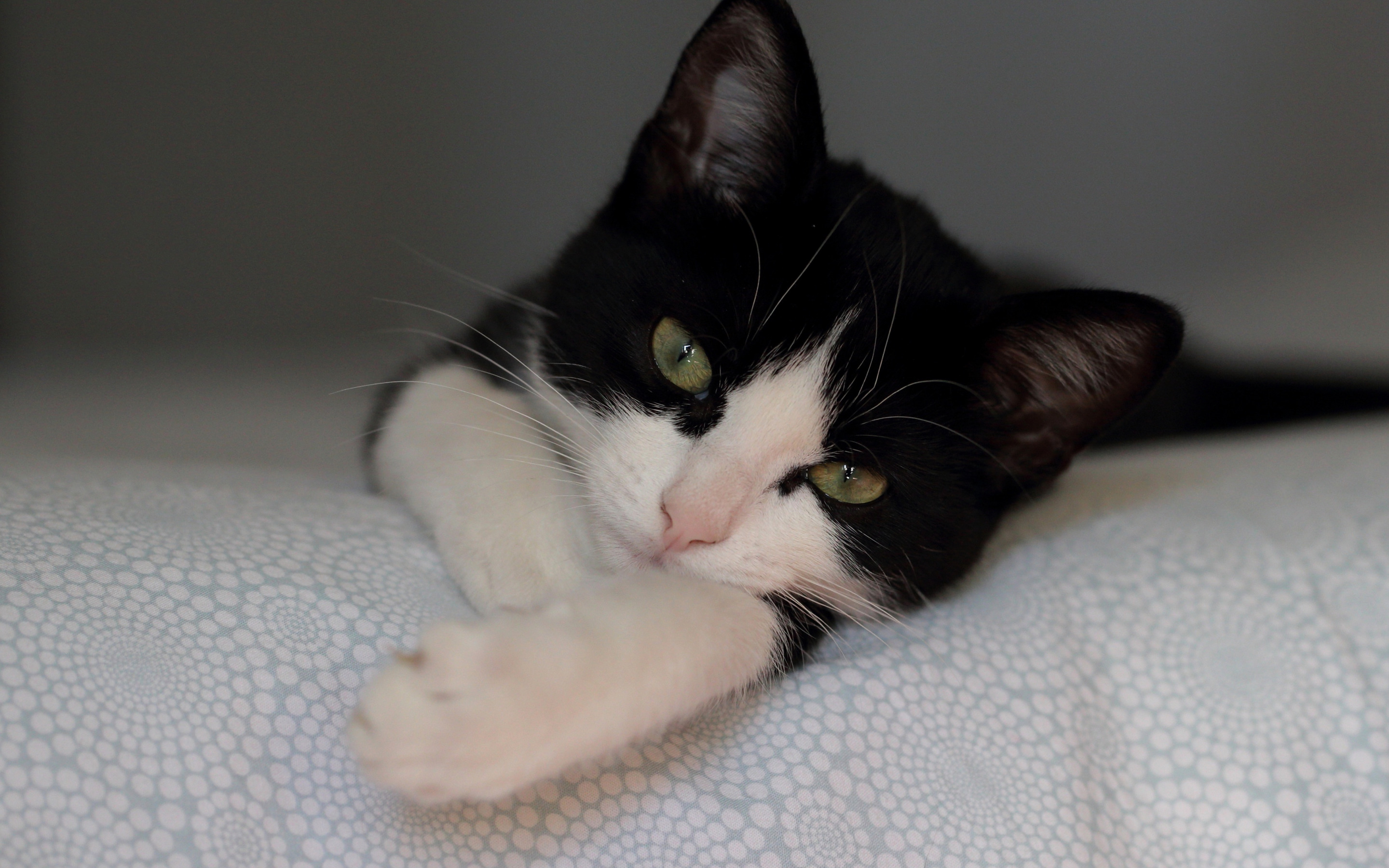 Description: A black and white cat laying on a bed with a white blanket and blue dots on it's back.