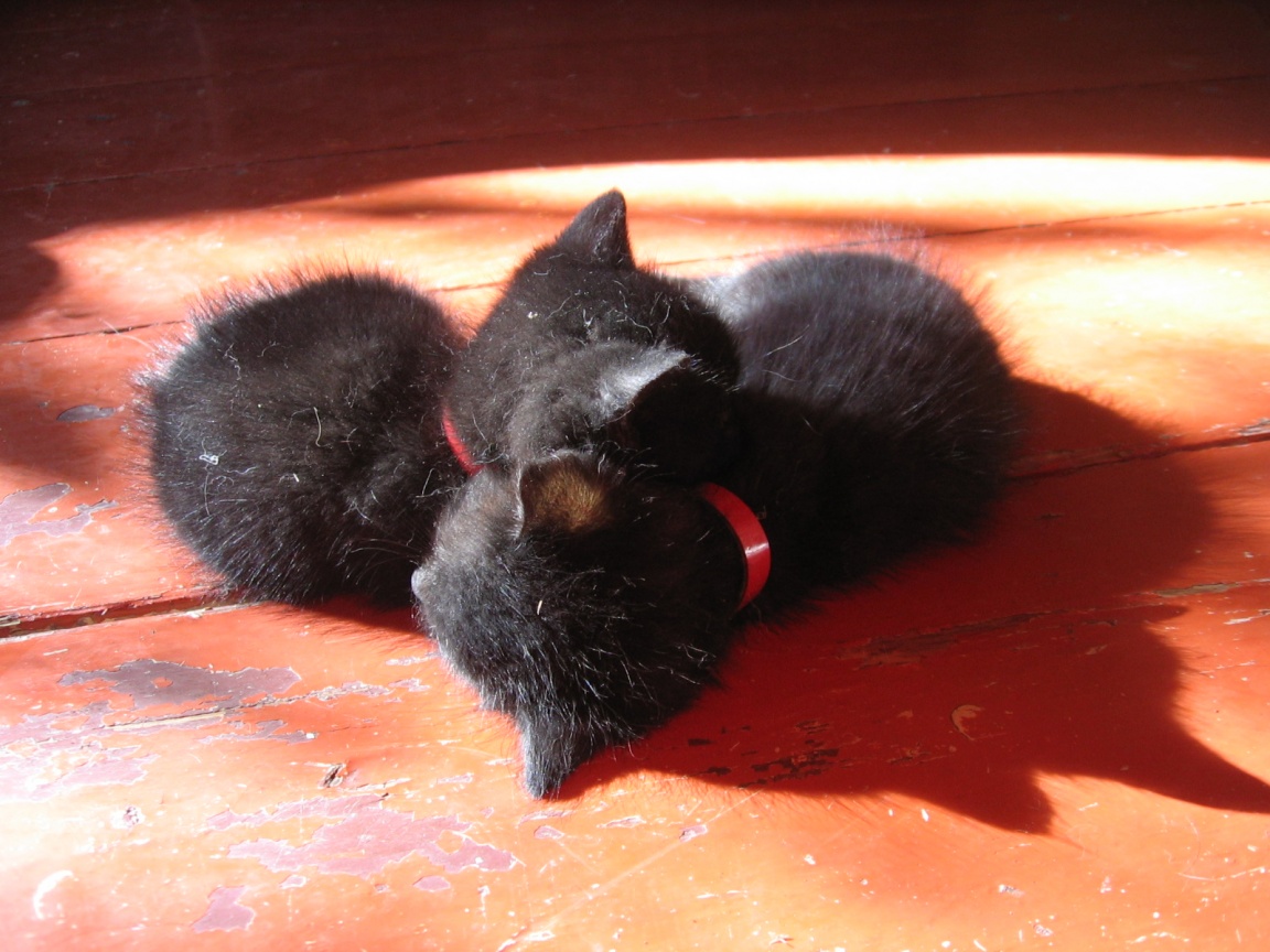 Description: A black cat laying on top of a wooden floor next to a red collared collared cat on its back.