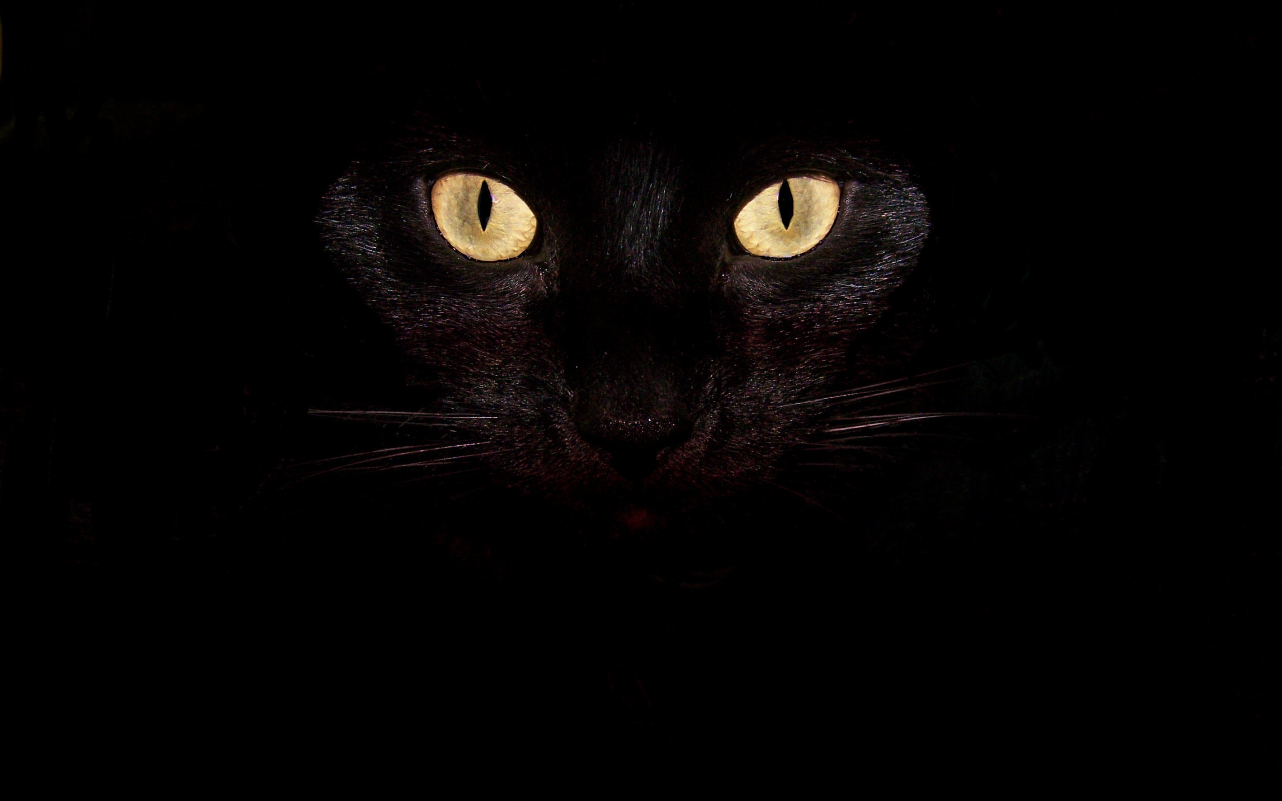 Description: A black cat with yellow eyes looking at the camera in the dark with a black background and a white spot.