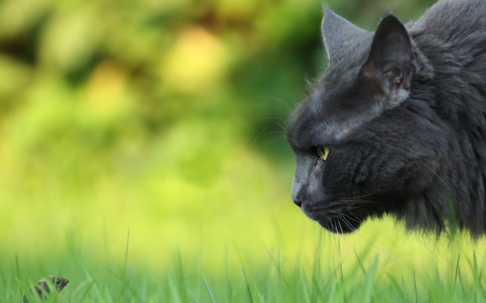 Description: A black cat with yellow eyes walking through the grass in the sun light of the day.