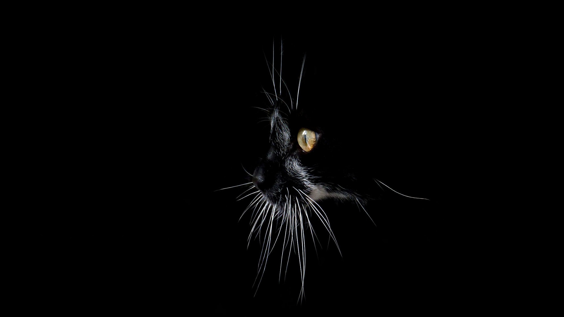 Description: A black cat with yellow eyes looking up at something in the dark sky with a black background and a white stripe.