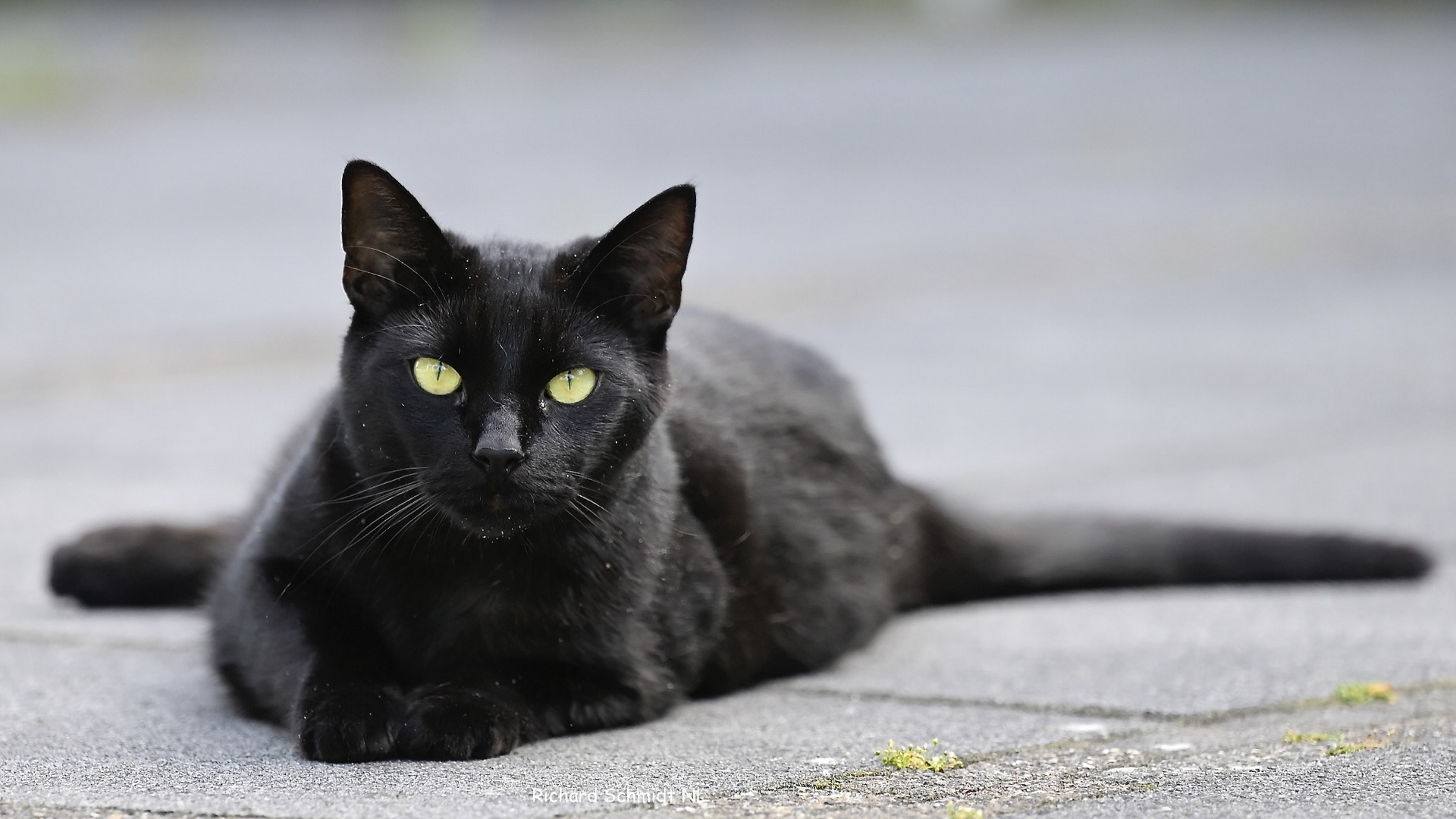 Description: A black cat with yellow eyes laying on the ground looking at the camera with a serious look on its face.