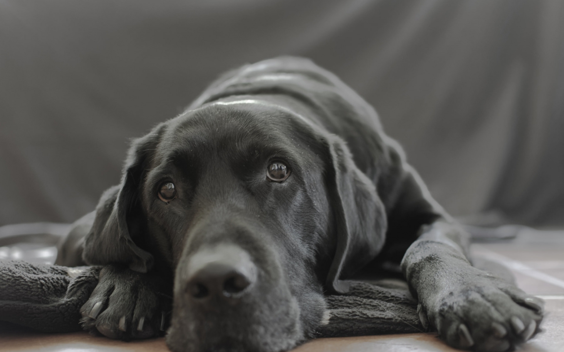 Description: A black dog laying on a couch with a gray blanket on it's back and eyes open and a black dog laying on the floor.